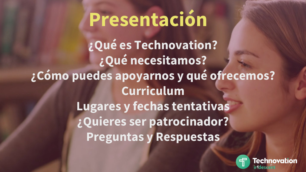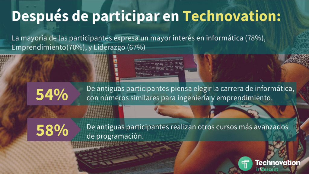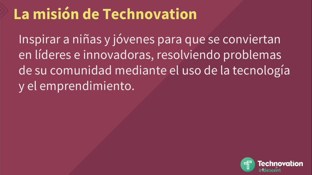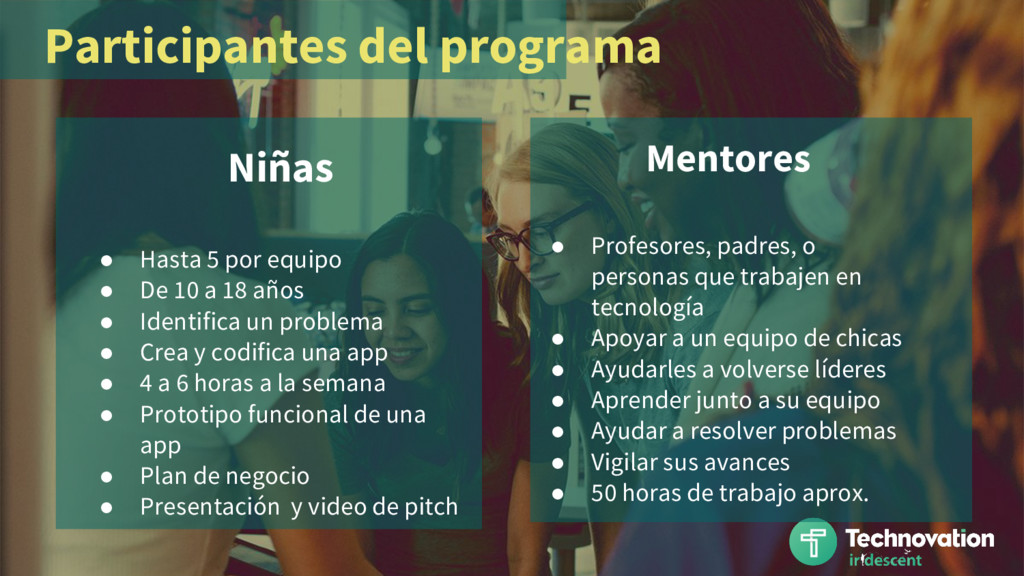 Technovation es el programa insignia de la organización global sin fines de lucro Iridescent. Cada año invita equipos de niñas de 10 a 18 años todo el mundo a aprender y desarrollar habilidades para resolver los problemas del mundo a través de la tecnología. Desde 2010, más de 10,000 chicas de 78 países han participado en Technovation Challenge. Con la ayuda de mentores voluntarios, ellas han desarrollado “startups” de aplicaciones móviles que han ayudado a resolver problemas en comunidades locales y regionales alrededor de todo el mundo.