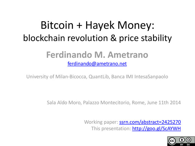 from money to good money: stable prices for a new economic era • Bitcoin is challenging established political and economic theory, Hayek Money will accelerate the transition to a new era • An opportunity for increased equality, justice, and wellness, it requires responsible actions by good willing people to help smooth the transition Ferdinando Ametrano 2014 23/23