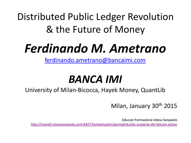 M. Ametrano [email protected] BANCA IMI University of Milan-Bicocca, Hayek Money, QuantLib Milan, January 30th 2015 Educast Formazione Intesa Sanpaolo http://mana0.intesasanpaolo.com:8347/tamtamy/em/permalink/alla-scoperta-del-bitcoin.action