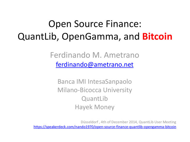 [email protected] Banca IMI IntesaSanpaolo Milano-Bicocca University QuantLib Hayek Money Düsseldorf , 4th of December 2014, QuantLib User Meeting https://speakerdeck.com/nando1970/open-source-finance-quantlib-opengamma-bitcoin