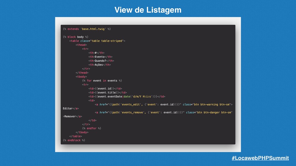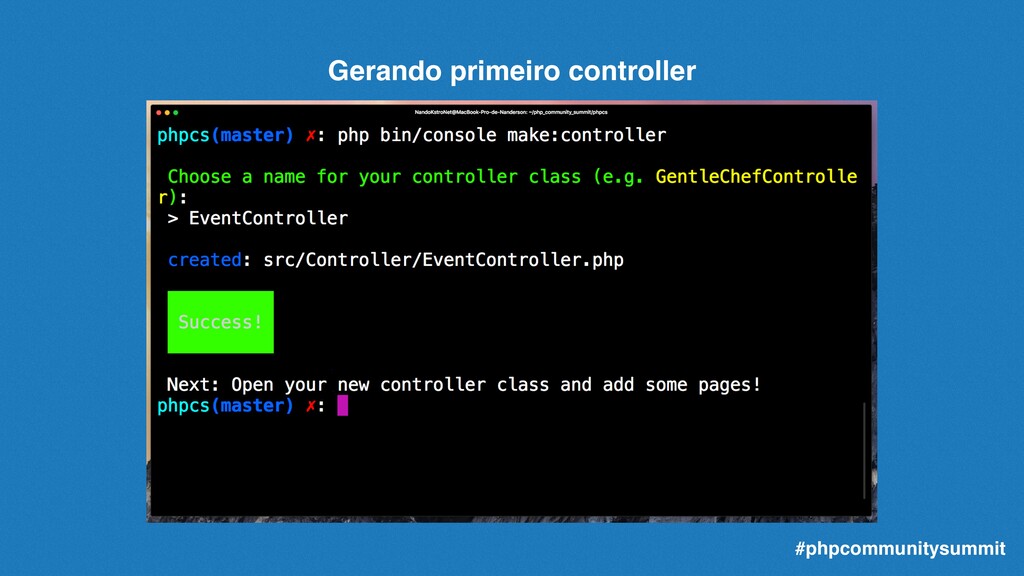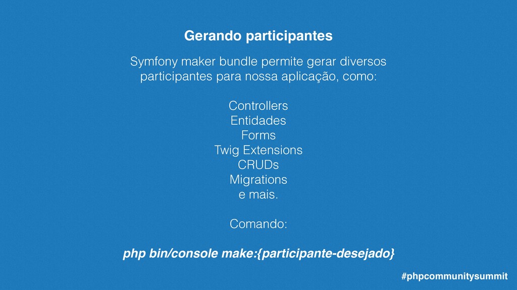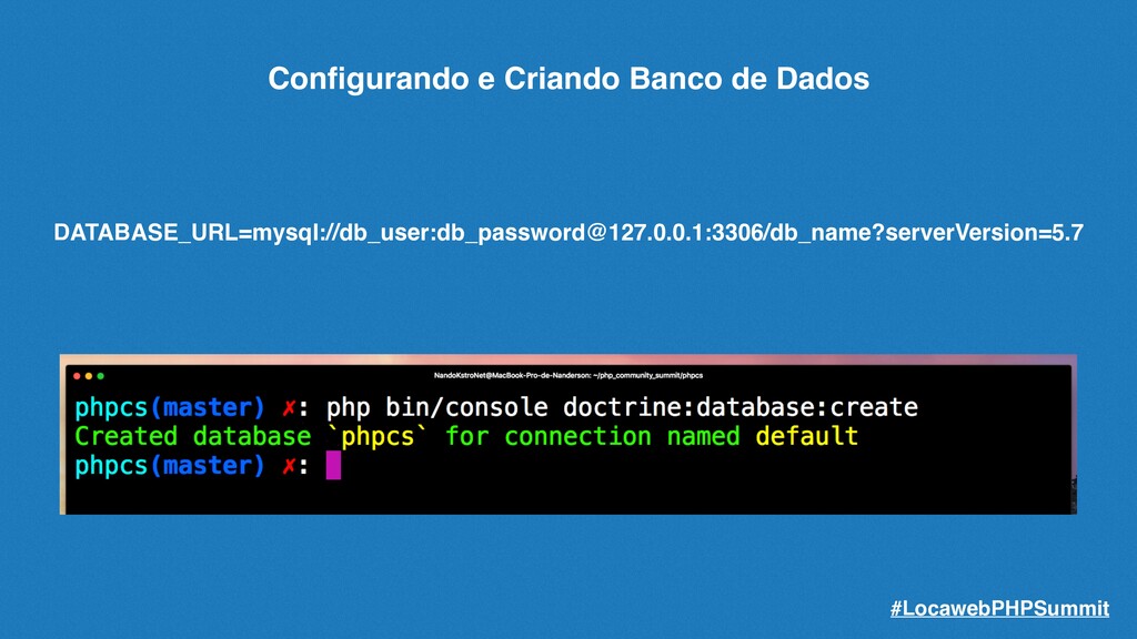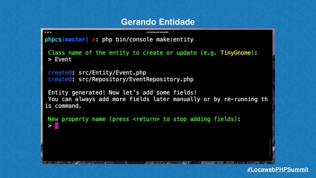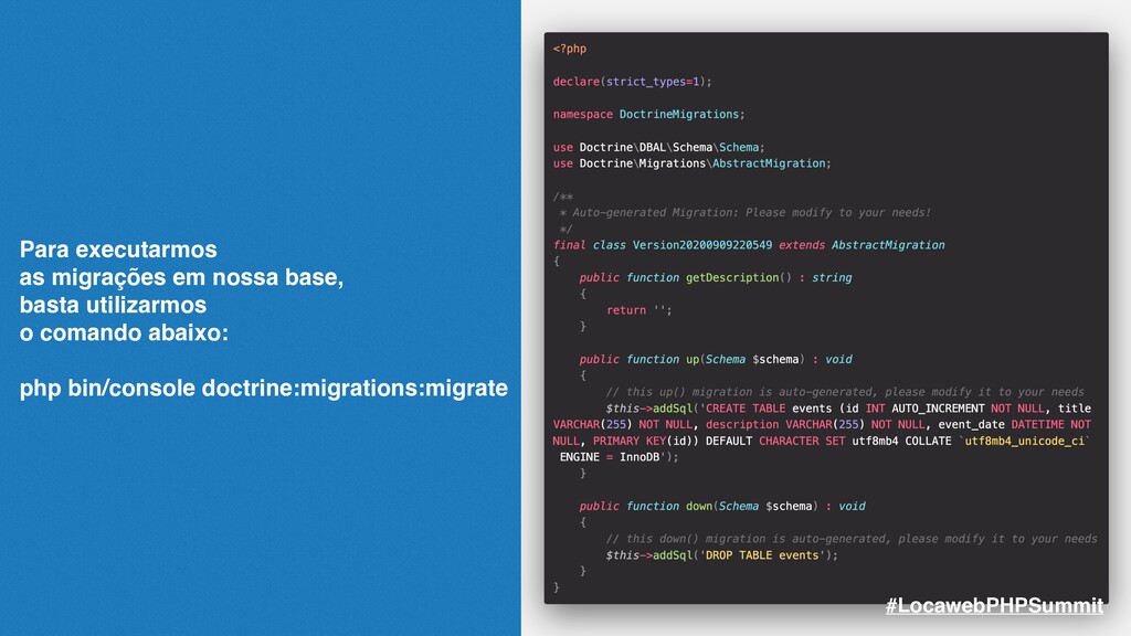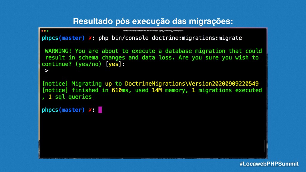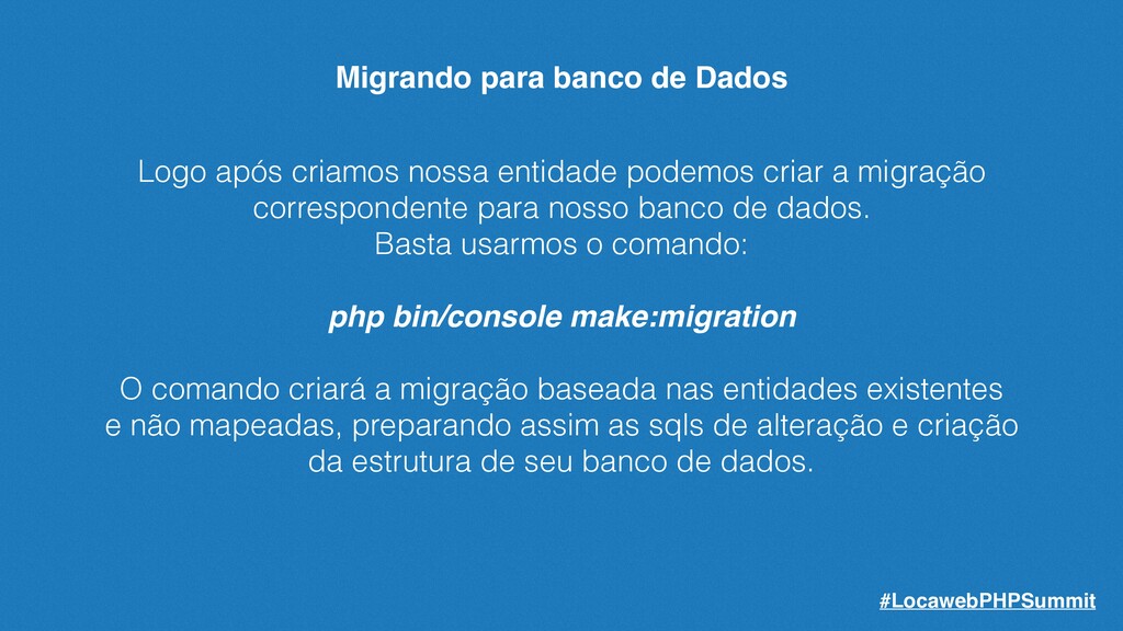 podemos criar a migração correspondente para nosso banco de dados. Basta usarmos o comando: php bin/console make:migration O comando criará a migração baseada nas entidades existentes e não mapeadas, preparando assim as sqls de alteração e criação da estrutura de seu banco de dados. #LocawebPHPSummit