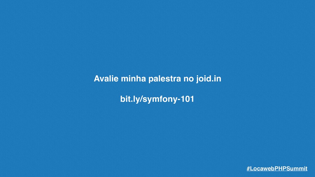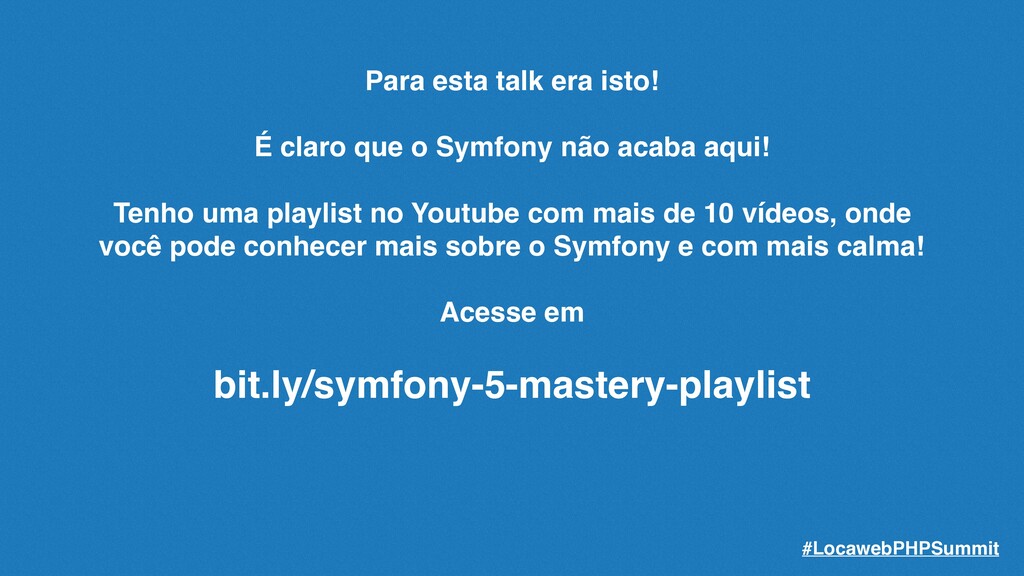 não acaba aqui! Tenho uma playlist no Youtube com mais de 10 vídeos, onde você pode conhecer mais sobre o Symfony e com mais calma! Acesse em bit.ly/symfony-5-mastery-playlist #LocawebPHPSummit