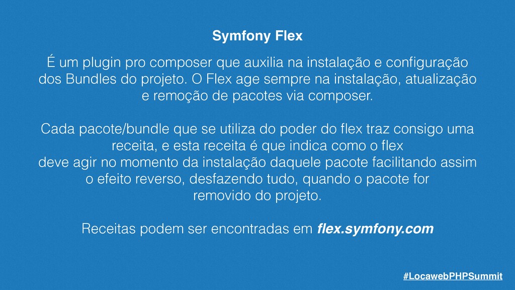 instalação e configuração dos Bundles do projeto. O Flex age sempre na instalação, atualização e remoção de pacotes via composer. Cada pacote/bundle que se utiliza do poder do flex traz consigo uma receita, e esta receita é que indica como o flex deve agir no momento da instalação daquele pacote facilitando assim o efeito reverso, desfazendo tudo, quando o pacote for removido do projeto. Receitas podem ser encontradas em flex.symfony.com #LocawebPHPSummit