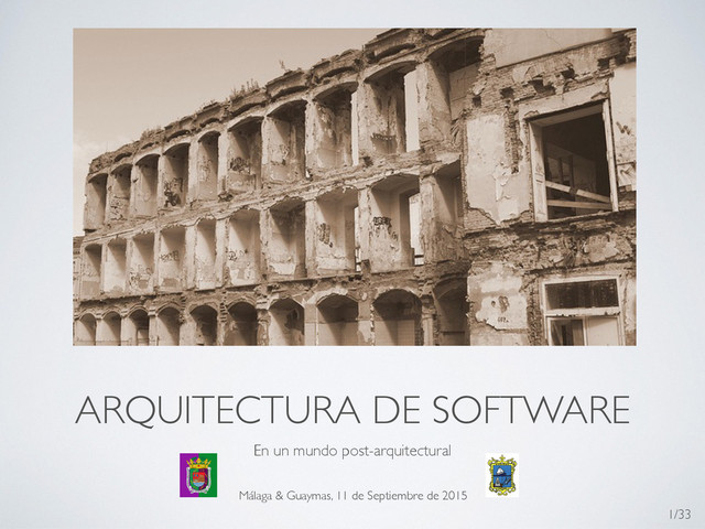 Sin embargo, hay patrones comunes • Pero dependen mucho de la tecnología • Framework is king: • MVC (Rails, Spring), MVP (Angular), … • Architecture: the lost years • https://www.youtube.com/watch?v=HhNIttd87xs 24/33 http://97things.oreilly.com/wiki/index.php/Home_Page_for_97_Things