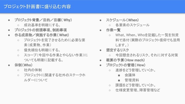 プロジェクト計画書に盛り込む内容 • プロジェクト背景/目的/目標( Why) ◦ 成功基準を明確にする。 • プロジェクトの前提事項、制約事項 • 作る成果物/実施する作業(