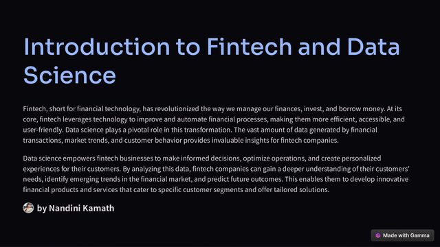 technology, has revolutionized the way we manage our finances, invest, and borrow money. At its core, fintech leverages technology to improve and automate financial processes, making them more efficient, accessible, and user-friendly. Data science plays a pivotal role in this transformation. The vast amount of data generated by financial transactions, market trends, and customer behavior provides invaluable insights for fintech companies. Data science empowers fintech businesses to make informed decisions, optimize operations, and create personalized experiences for their customers. By analyzing this data, fintech companies can gain a deeper understanding of their customers' needs, identify emerging trends in the financial market, and predict future outcomes. This enables them to develop innovative financial products and services that cater to specific customer segments and offer tailored solutions. by Nandini Kamath