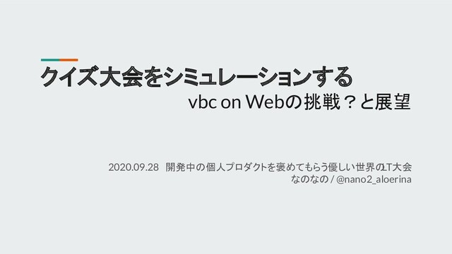 クイズ大会をシミュレーションする vbc on Webの挑戦?と展望 2020.09.28 開発中の個人プロダクトを褒めてもらう優しい世界の LT大会 なのなの / @nano2_aloerina
