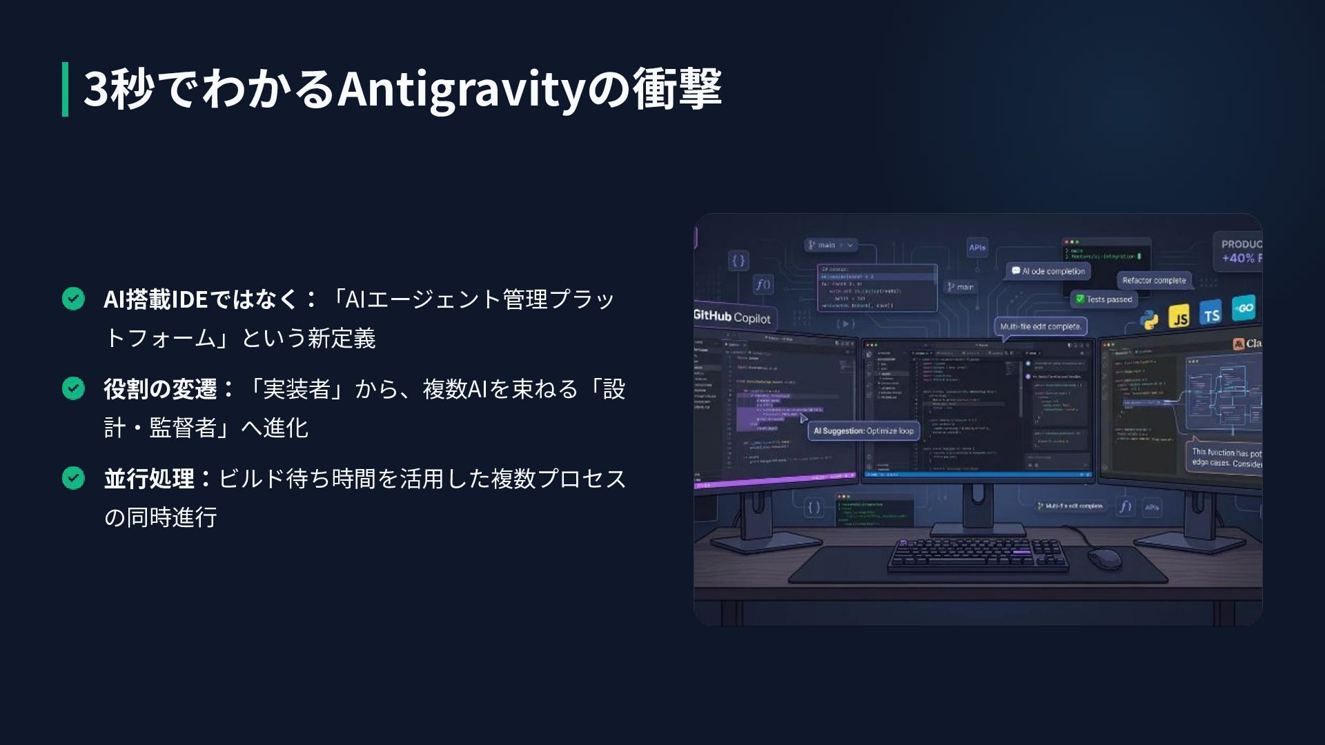 AI搭載IDEではなく:「AIエージェント管理プラッ トフォーム」という新定義 役割の変遷:「実装者」から、複数AIを束ねる「設 計‧監督者」へ進化 並⾏処理:ビルド待ち時間を活⽤した複数プロセス の同時進⾏ 3秒でわかるAntigravityの衝撃