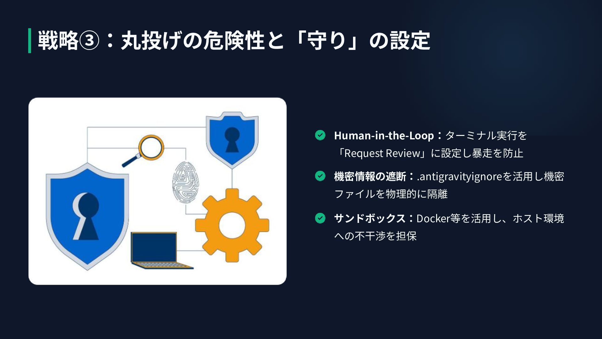 Human-in-the-Loop:ターミナル実⾏を 「Request Review」に設定し暴⾛を防⽌ 機密情報の遮断:.antigravityignoreを活⽤し機密 ファイルを物理的に隔離 サンドボックス:Docker等を活⽤し、ホスト環境 への不⼲渉を担保 戦略③:丸投げの危険性と「守り」の設定