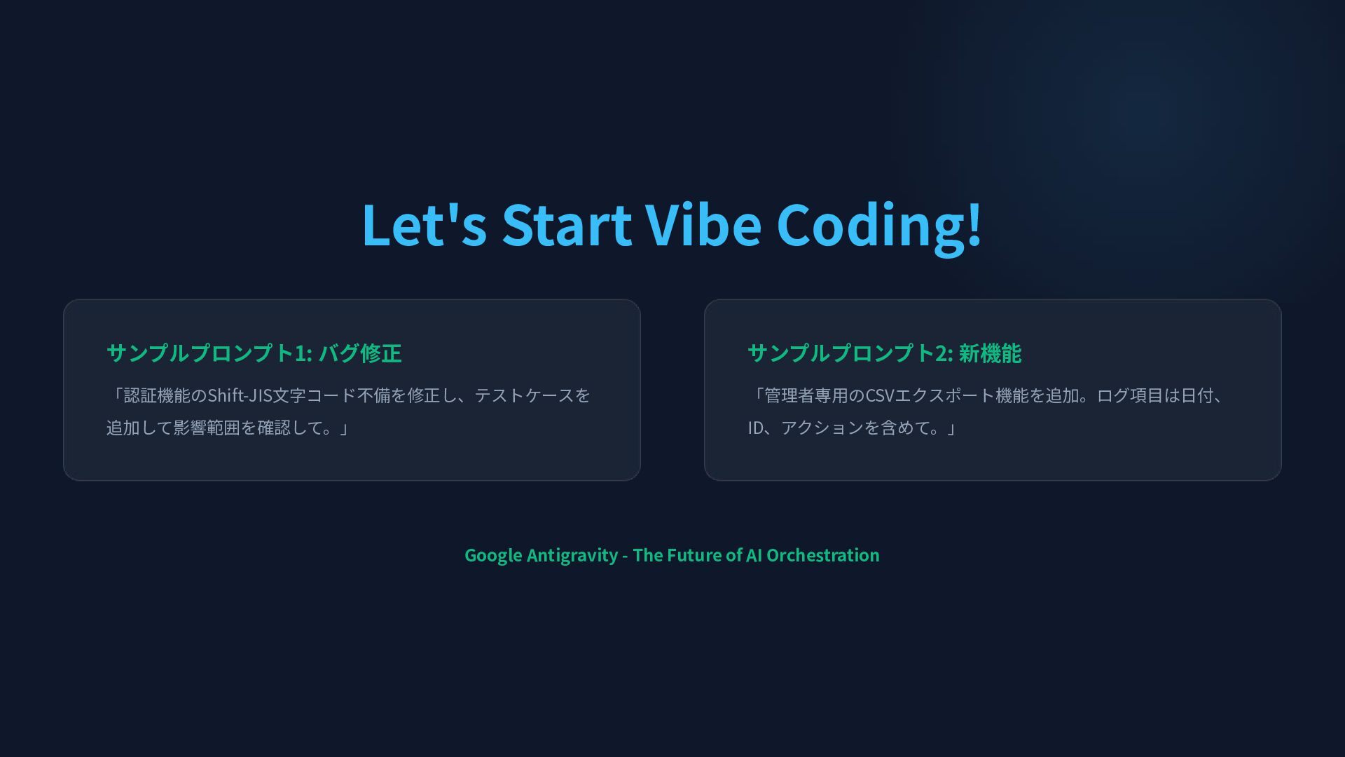 AI Orchestration サンプルプロンプト1: バグ修正 「認証機能のShift-JIS⽂字コード不備を修正し、テストケースを 追加して影響範囲を確認して。」 サンプルプロンプト2: 新機能 「管理者専⽤のCSVエクスポート機能を追加。ログ項⽬は⽇付、 ID、アクションを含めて。」