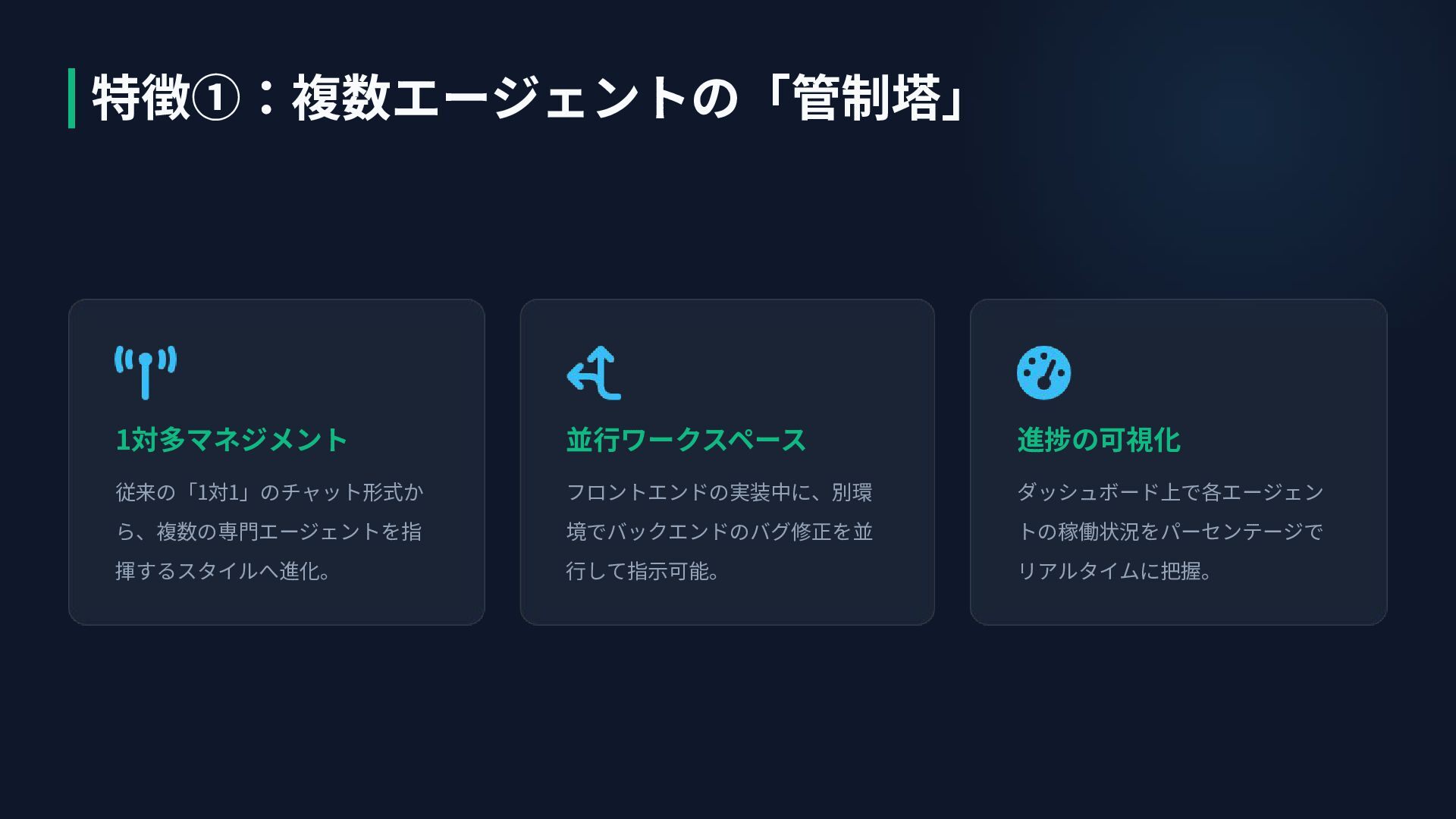 1対多マネジメント 従来の「1対1」のチャット形式か ら、複数の専⾨エージェントを指 揮するスタイルへ進化。 並⾏ワークスペース フロントエンドの実装中に、別環 境でバックエンドのバグ修正を並 ⾏して指⽰可能。 進捗の可視化 ダッシュボード上で各エージェン