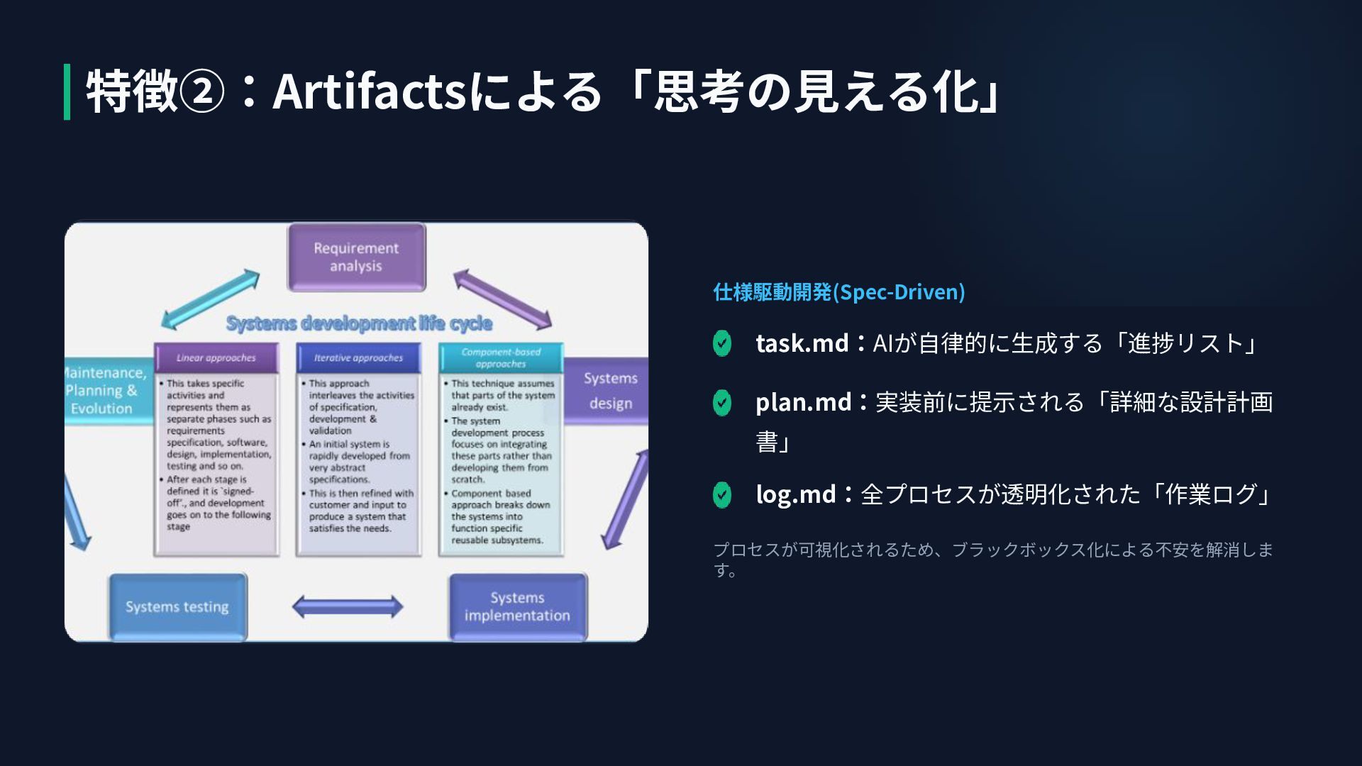 仕様駆動開発(Spec-Driven) プロセスが可視化されるため、ブラックボックス化による不安を解消しま す。 task.md:AIが⾃律的に⽣成する「進捗リスト」 plan.md:実装前に提⽰される「詳細な設計計画 書」 log.md:全プロセスが透明化された「作業ログ」 特徴②:Artifactsによる「思考の⾒える化」