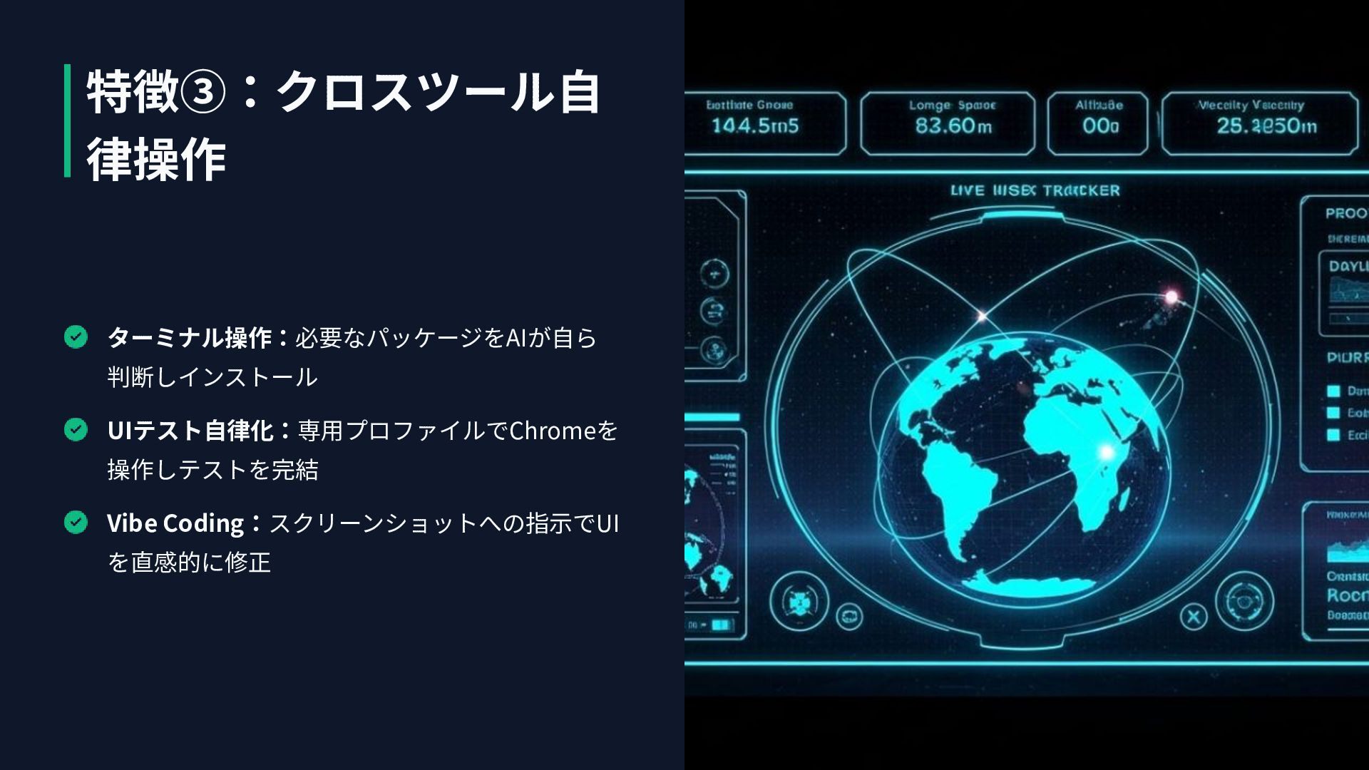 特徴③:クロスツール⾃ 律操作 ターミナル操作:必要なパッケージをAIが⾃ら 判断しインストール UIテスト⾃律化:専⽤プロファイルでChromeを 操作しテストを完結 Vibe Coding:スクリーンショットへの指⽰でUI を直感的に修正