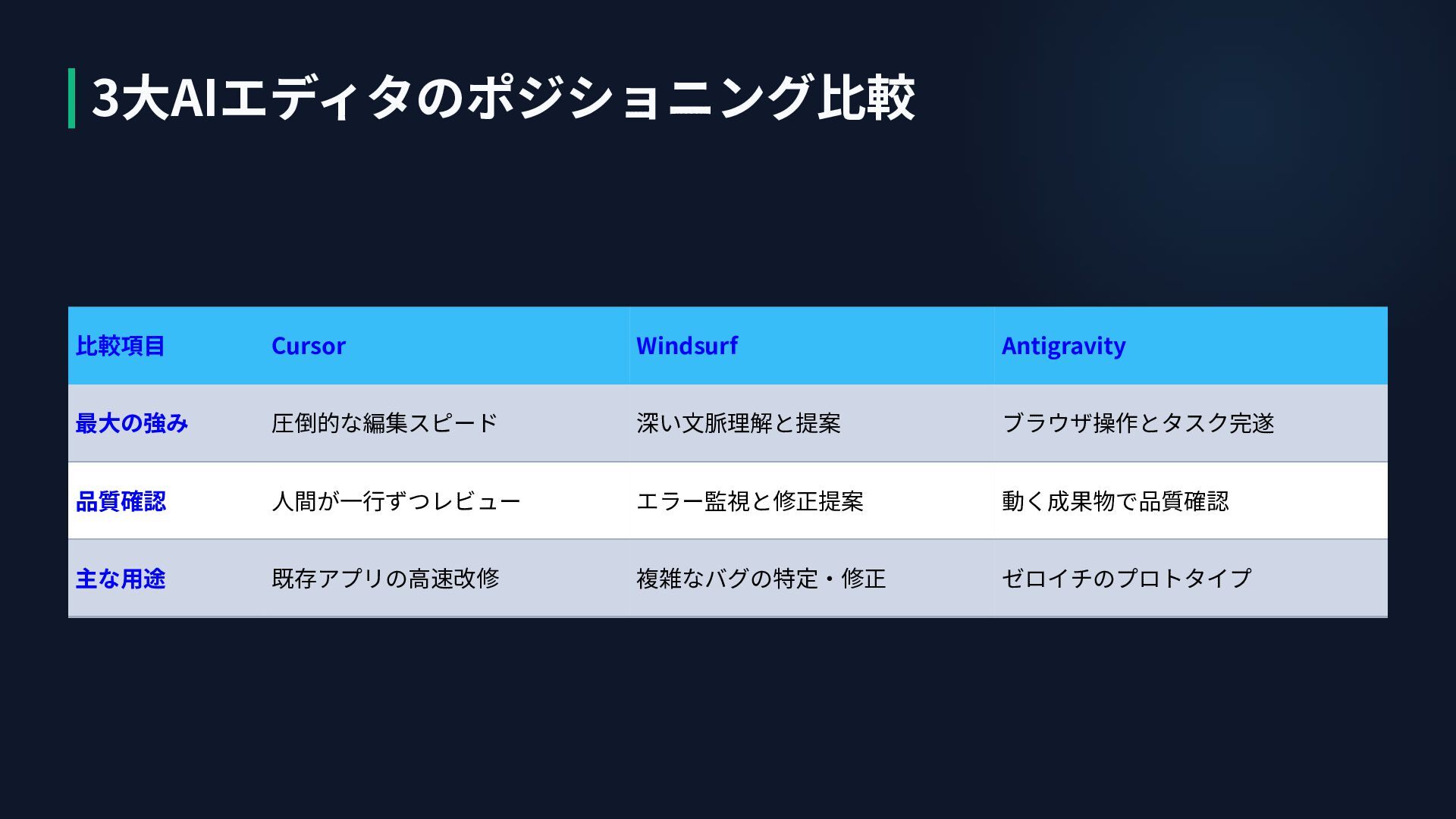 ⽐較項⽬ Cursor Windsurf Antigravity 最⼤の強み 圧倒的な編集スピード 深い⽂脈理解と提案 ブラウザ操作とタスク完遂 品質確認 ⼈間が⼀⾏ずつレビュー