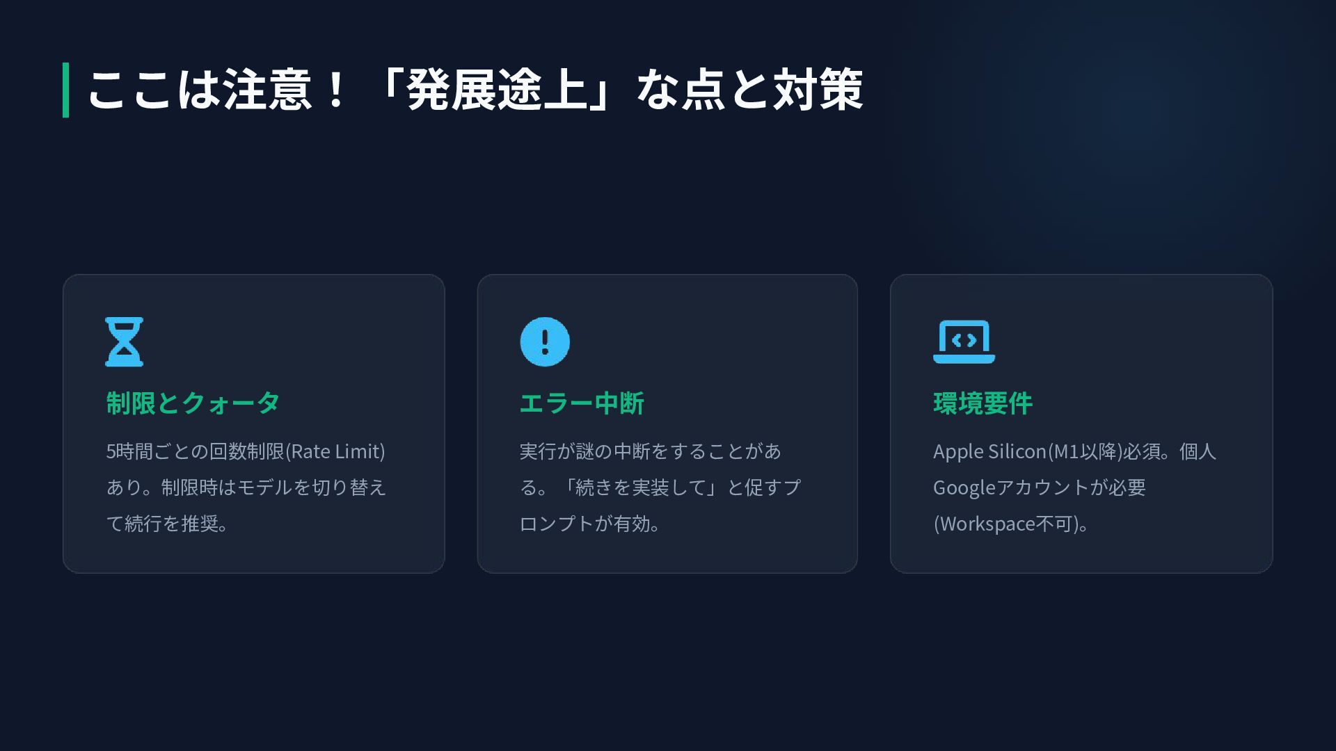 制限とクォータ 5時間ごとの回数制限(Rate Limit) あり。制限時はモデルを切り替え て続⾏を推奨。 エラー中断 実⾏が謎の中断をすることがあ る。「続きを実装して」と促すプ ロンプトが有効。 環境要件