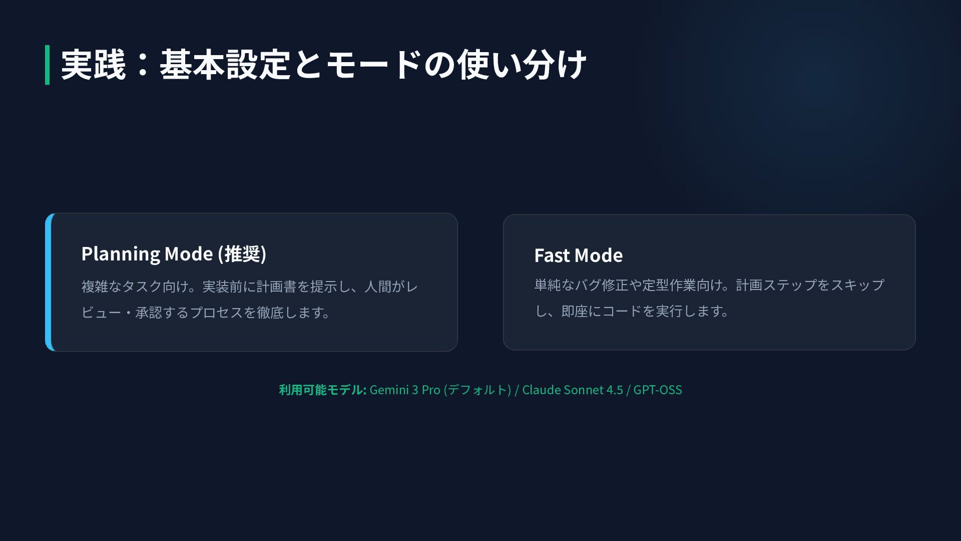 GPT-OSS Planning Mode (推奨) 複雑なタスク向け。実装前に計画書を提⽰し、⼈間がレ ビュー‧承認するプロセスを徹底します。 Fast Mode 単純なバグ修正や定型作業向け。計画ステップをスキップ し、即座にコードを実⾏します。 実践:基本設定とモードの使い分け