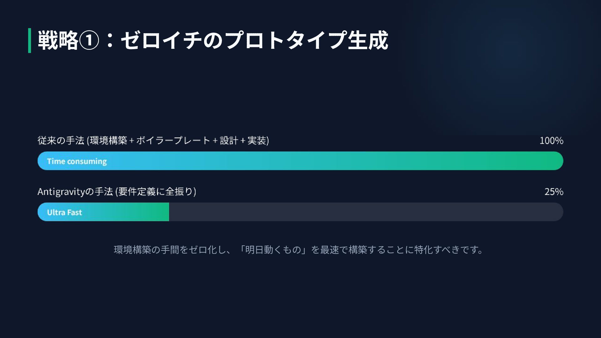 環境構築の⼿間をゼロ化し、「明⽇動くもの」を最速で構築することに特化すべきです。 戦略①:ゼロイチのプロトタイプ⽣成