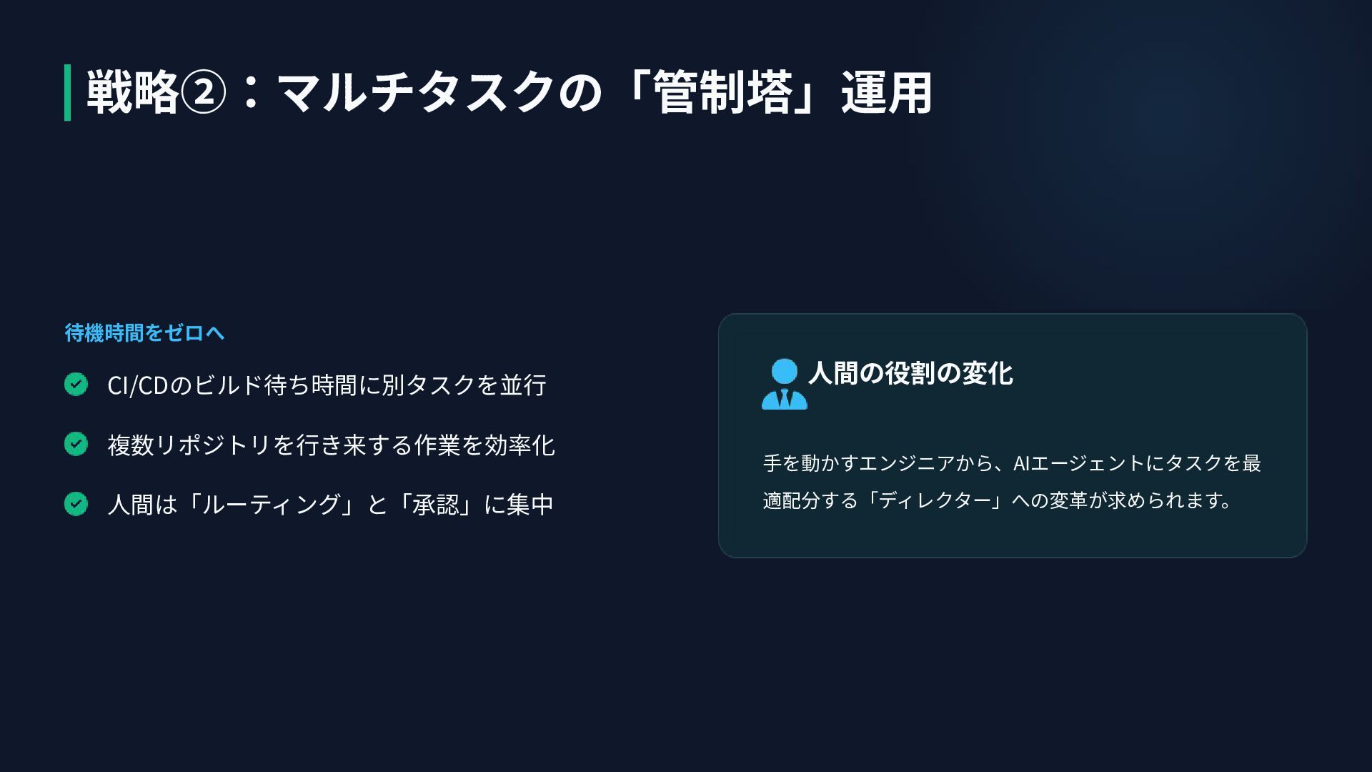 待機時間をゼロへ ⼈間の役割の変化 ⼿を動かすエンジニアから、AIエージェントにタスクを最 適配分する「ディレクター」への変⾰が求められます。 CI/CDのビルド待ち時間に別タスクを並⾏ 複数リポジトリを⾏き来する作業を効率化 ⼈間は「ルーティング」と「承認」に集中 戦略②:マルチタスクの「管制塔」運⽤