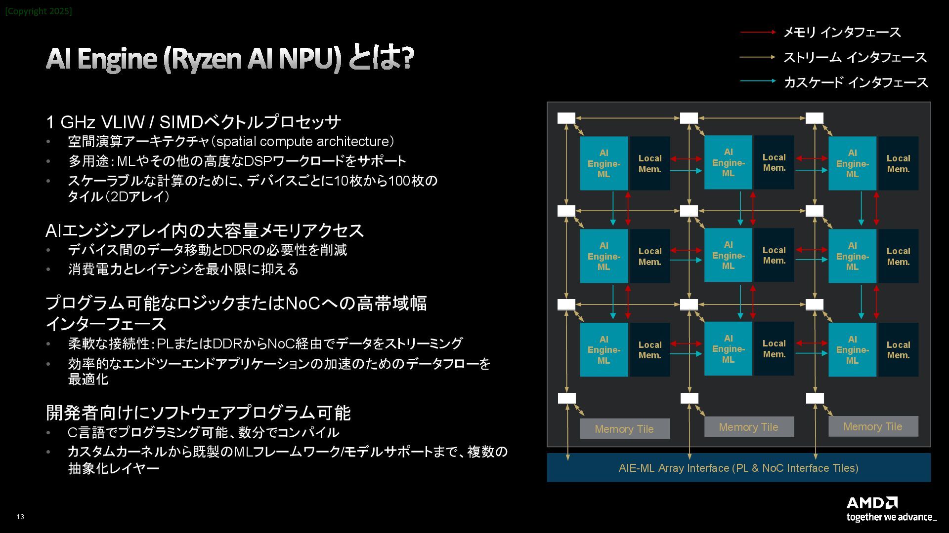 / SIMDベクトルプロセッサ • 空間演算アーキテクチャ(spatial compute architecture) • 多用途:MLやその他の高度なDSPワークロードをサポート • スケーラブルな計算のために、デバイスごとに10枚から100枚の タイル(2Dアレイ) AIエンジンアレイ内の大容量メモリアクセス • デバイス間のデータ移動とDDRの必要性を削減 • 消費電力とレイテンシを最小限に抑える プログラム可能なロジックまたはNoCへの高帯域幅 インターフェース • 柔軟な接続性:PLまたはDDRからNoC経由でデータをストリーミング • 効率的なエンドツーエンドアプリケーションの加速のためのデータフローを 最適化 開発者向けにソフトウェアプログラム可能 • C言語でプログラミング可能、数分でコンパイル • カスタムカーネルから既製のMLフレームワーク/モデルサポートまで、複数の 抽象化レイヤー AI Engine- ML Local Mem. AIE-ML Array Interface (PL & NoC Interface Tiles) AI Engine- ML Local Mem. AI Engine- ML Local Mem. AI Engine- ML Local Mem. AI Engine- ML Local Mem. AI Engine- ML Local Mem. AI Engine- ML Local Mem. AI Engine- ML Local Mem. AI Engine- ML Local Mem. Memory Tile Memory Tile Memory Tile メモリ インタフェース ストリーム インタフェース カスケード インタフェース