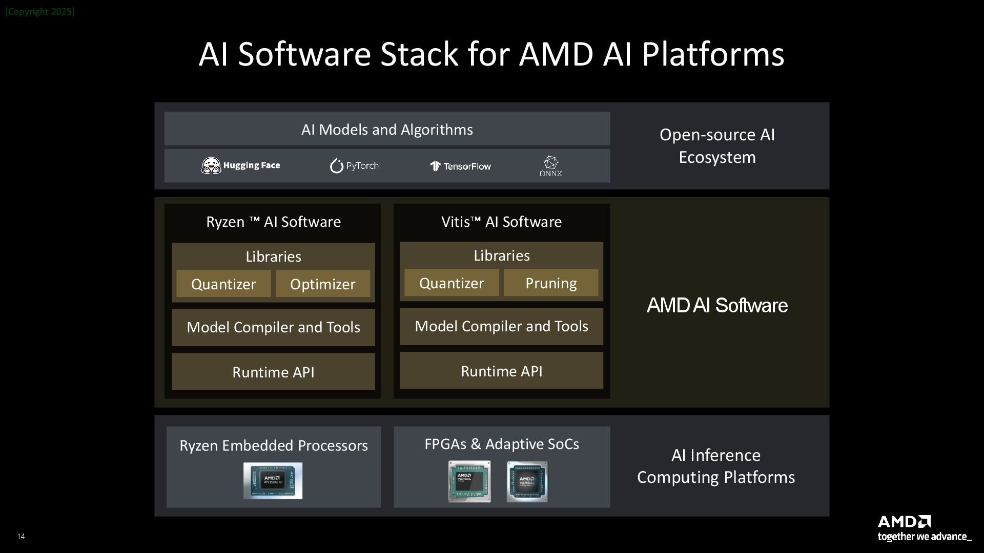 Models and Algorithms Open-source AI Ecosystem Ryzen Embedded Processors AI Inference Computing Platforms FPGAs & Adaptive SoCs Libraries Model Compiler and Tools Runtime API Quantizer Pruning Vitis AI Software Libraries Model Compiler and Tools Runtime API Quantizer Optimizer Ryzen AI Software AMD AI Software