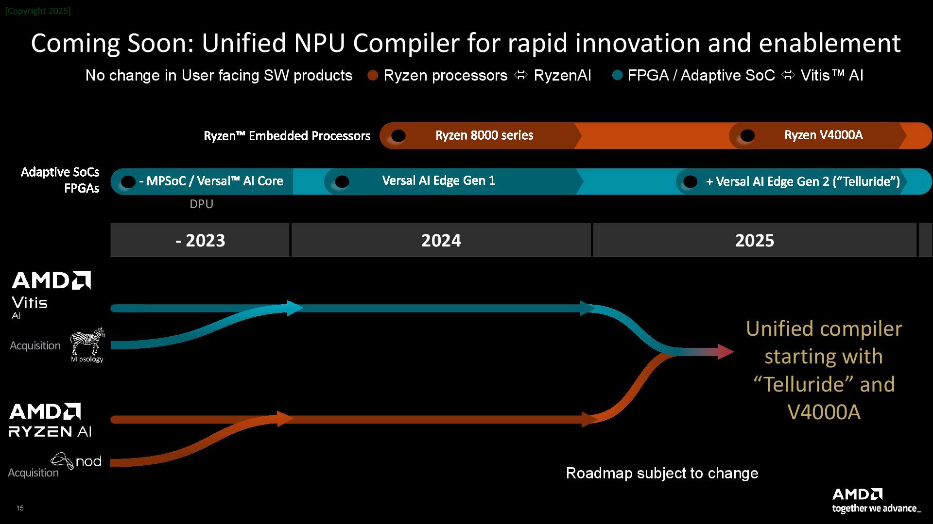 for rapid innovation and enablement - 2023 2024 2025 + Versal AI Edge Gen 2 (“Telluride”) Versal AI Edge Gen 1 - MPSoC / Versal AI Core DPU Ryzen 8000 series Ryzen V4000A Adaptive SoCs FPGAs Acquisition Acquisition Unified compiler starting with “Telluride” and V4000A No change in User facing SW products Ryzen processors  RyzenAI FPGA / Adaptive SoC  Vitis AI Roadmap subject to change