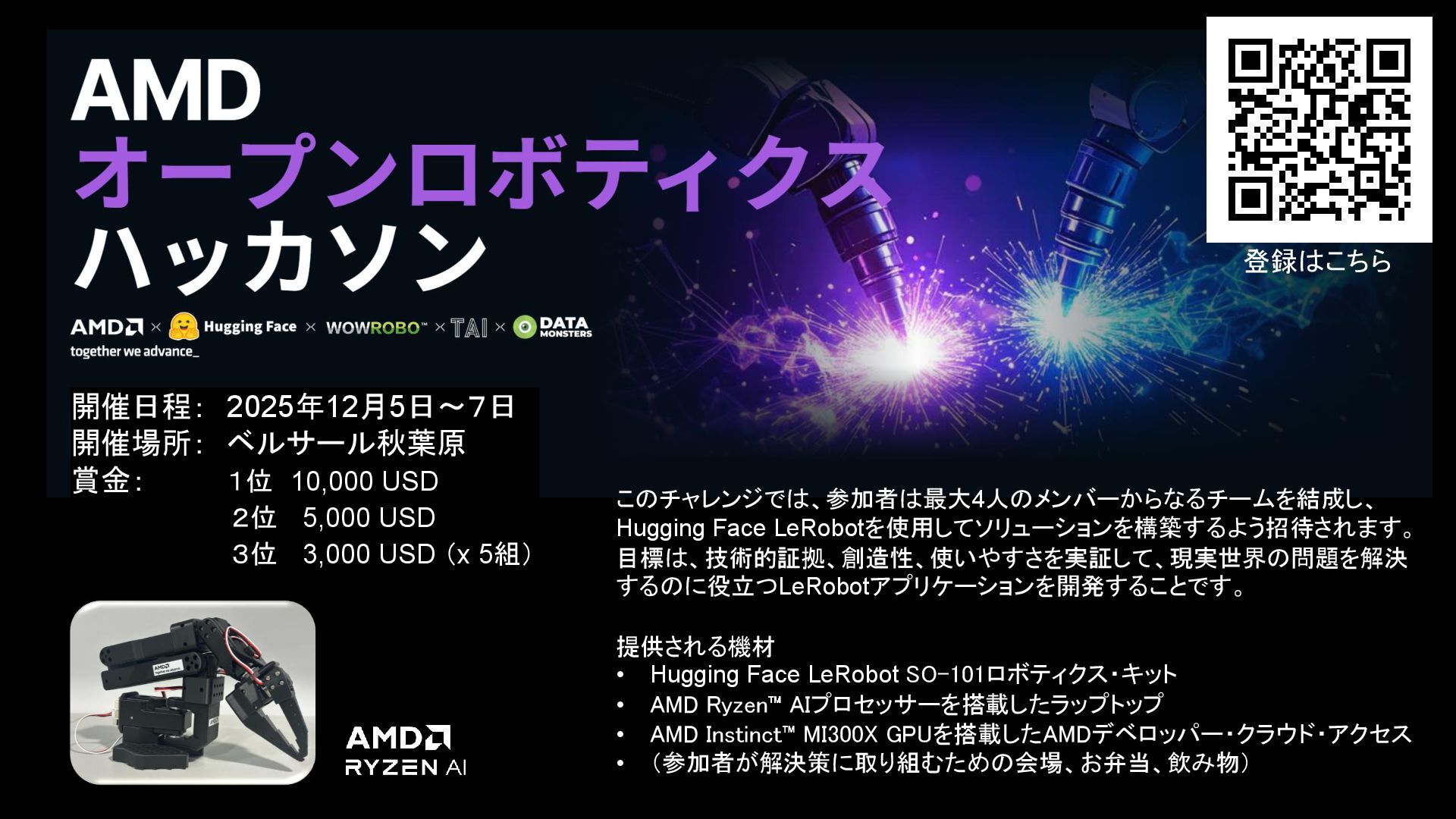 USD 3位 3,000 USD (x 5組) 登録はこちら 提供される機材 • Hugging Face LeRobot SO-101ロボティクス・キット • AMD Ryzen AIプロセッサーを搭載したラップトップ • AMD Instinct MI300X GPUを搭載したAMDデベロッパー・クラウド・アクセス • (参加者が解決策に取り組むための会場、お弁当、飲み物) このチャレンジでは、参加者は最大4人のメンバーからなるチームを結成し、 Hugging Face LeRobotを使用してソリューションを構築するよう招待されます。 目標は、技術的証拠、創造性、使いやすさを実証して、現実世界の問題を解決 するのに役立つLeRobotアプリケーションを開発することです。