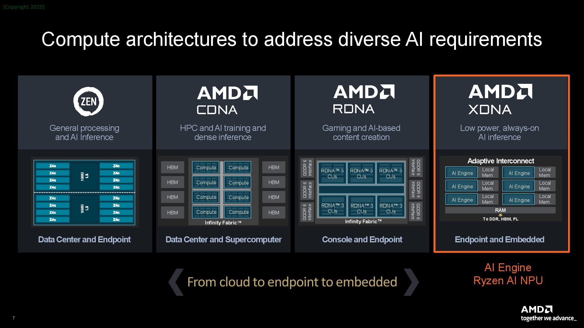 Center and Supercomputer Console and Endpoint Endpoint and Embedded Data Center and Endpoint HPC and AI training and dense inference Gaming and AI-based content creation Low power, always-on AI inference General processing and AI Inference HBM HBM HBM HBM HBM HBM HBM HBM Infinity Fabric Compute Compute Compute Compute Compute Compute Compute Compute Adaptive Interconnect RAM To DDR, HBM, PL Local Mem. Local Mem. Local Mem. Local Mem. Local Mem. Local Mem. AI Engine AI Engine AI Engine AI Engine AI Engine AI Engine GDDR 6 Interface Infinity Fabric GDDR 6 Interface GDDR 6 Interface GDDR 6 Interface GDDR 6 Interface GDDR 6 Interface RDNA 3 CUs RDNA 3 CUs RDNA 3 CUs RDNA 3 CUs RDNA 3 CUs RDNA 3 CUs 16MB L3 Z4c Z4c Z4c Z4c Z4c Z4c Z4c Z4c 16MB L3 Z4c Z4c Z4c Z4c Z4c Z4c Z4c Z4c From cloud to endpoint to embedded AI Engine Ryzen AI NPU