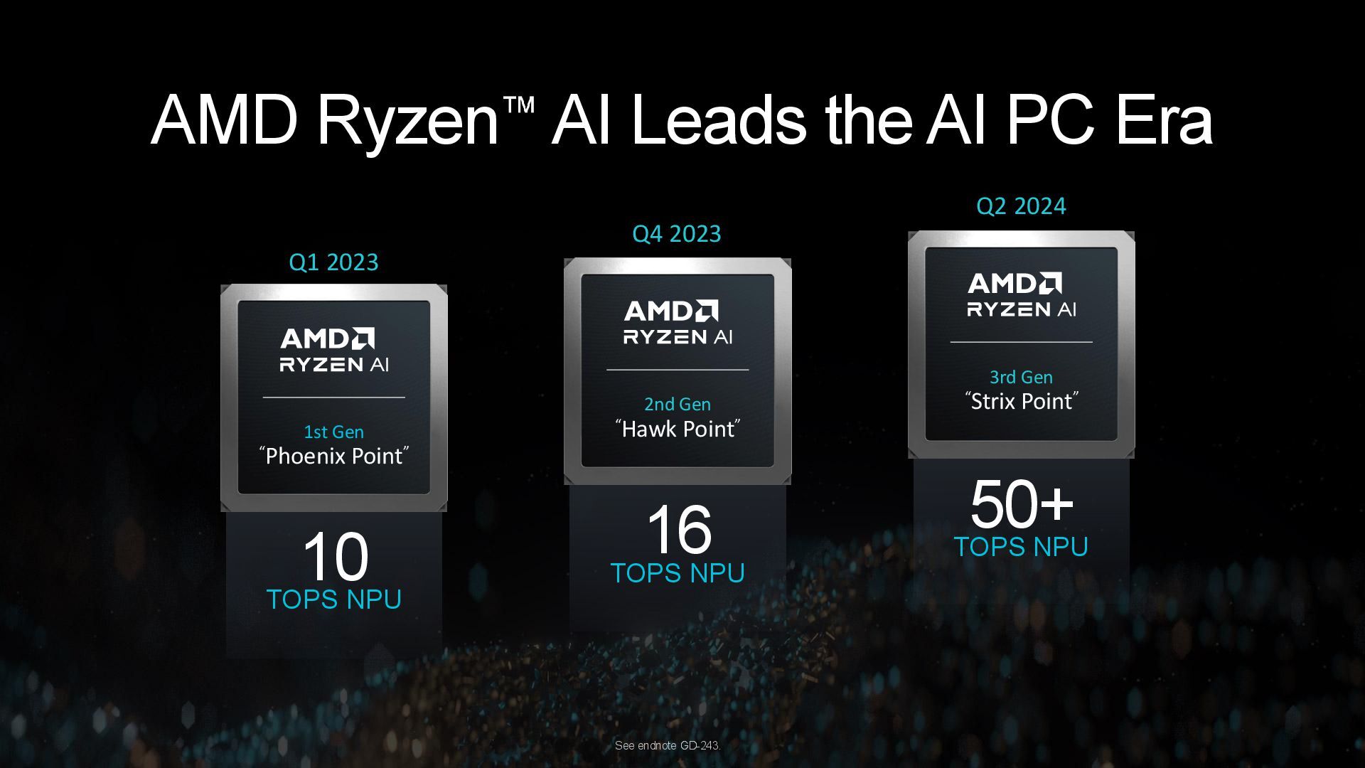 50+ TOPS NPU 3rd Gen “Strix Point” 2nd Gen “Hawk Point” 16 TOPS NPU 1st Gen “Phoenix Point” 10 TOPS NPU Q1 2023 Q4 2023 Q2 2024 See endnote GD-243.