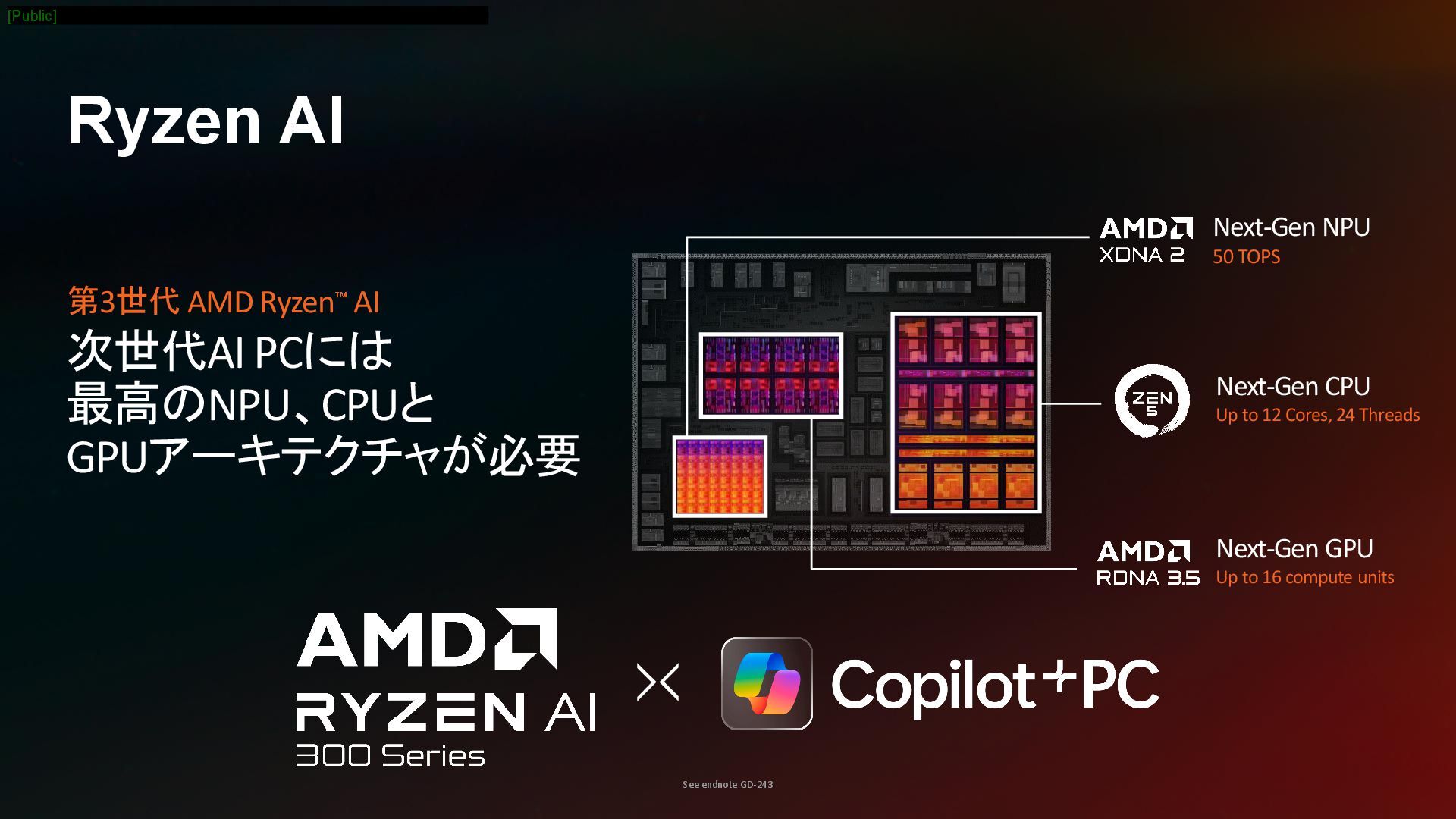 Up to 12 Cores, 24 Threads Next-Gen NPU 50 TOPS Next-Gen GPU Up to 16 compute units See endnote GD-243 Ryzen AI [Public]