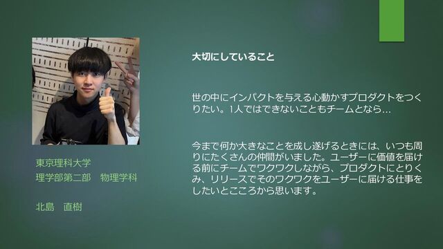 東京理科大学 理学部第二部 物理学科 北島 直樹 大切にしていること 世の中にインパクトを与える心動かすプロダクトをつく りたい。1人ではできないこともチームとなら… 今まで何か大きなことを成し遂げるときには、いつも周 りにたくさんの仲間がいました。ユーザーに価値を届け