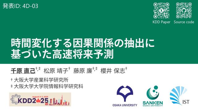 be the :8-dimensional latent vector for the variate inherent signal 4(8) (C) at time point C, e(C) be the 3- onal inherent signals at time point C (i.e., e(C) = {4(8) (C)}3 8=1 ), be the 3-dimensional estimated vector at time point C. The g equations govern our single regime, s(8) (C + 1) = ⇤(8)s(8) (C) (1 8 3) 4(8) (C) = g 1( (8)s(8) (C)) (1 8 3) v(C) = ] 1e(C) (3) l 2, we require an additional parameter, demixing matrix ], ! Time " ! Regi " 特徴的な時系列パターン Ø 単⼀の時系列パターンは以下のとおり DEIM2025 © 2025 Naoki Chihara et al. 28 Im Re frequency decay rate ! ! ∠ !! eigenvalue !! Interpretability of modes (1 ≤ $ ≤ %! ) Inherent signal !(") !(") " − ℎ + 1 ℎ "(") ℎ '" '" '" #(") , Self-dynamics factor set ((") " ⇓ Hankel matrix ) ⇓ (a) ݻ༗μΠφϛΫεू߹ (i.e., D(i) = {Φ(i) , Λ(i) }) Multivariate time series ! " # ⋮ !(") !($) Regime parameter set $ , # # "%$ Mixing matrix , # # "%$ Inherent signals % #($) #(") " ⋮ Causal relationship $ #(&) ⇓ ⇓ (b) ϨδʔϜ (i.e., θ = {W , D(1) , ..., D(d) }) ਤ 2: ModePlait ͷϞσϧ֓ཁਤ: (a) ಈతγεςϜʹै͏ i ൪ͷมʹݻ༗ͳ୯มྔ৴߸ e(i) ͔ΒજࡏతͳμΠφϛΫεΛ நग़͢Δ. (b) ଟ࣍ݩ࣌ܥྻσʔλࠞ߹ߦྻ W −1 ͱ d ݸͷࣗݾۦಈҼࢠ {D(1) , ..., D(d) } ʹΑͬͯදݱ͞ΕΔɽ . 1 ModePlait Ϟσϧ ຊઅͰఏҊϞσϧͷৄࡉΛड़ΔɽॳΊʹඞཁͳ֓೦ͷఆ ٛʹ͍ͭͯઆ໌͢Δɽ ఆٛ 1 (ݻ༗৴߸ɿE). ඇΨεʹै͏ d ݸͷ૬ޓʹಠཱ ͨ͠ཁૉΛ࣋ͭ৴߸ E = {e(i) }d i=1 Λݻ༗৴߸ͱݺͿɽͨͩ͠ɼ (i) = {e(i) (1), ..., e(i) (t)} i ൪ͷ୯มྔ࣌ܥྻͰ͋Δɽ͜ Ϋτϧɼݩͷঢ়ଶͱඍಉ૬ͳμΠφϛΫεΛ࣋ͭ͜ͱ͕อ ূ͞ΕΔɽײతʹઆ໌Λ͢Δͱɼ͜ͷ࠶ߏݩͷྗֶܥͷ ಛੑΛཧతʹอͭɼͭ·Γɼϋϯέϧߦྻ H(i) ͷղੳΛ௨ ͯ͡ɼݩͷσʔλ͔Βநग़Ͱ͖ͳ͍ॏཁͳಛΛ໌Β͔ ʹ͢Δ͜ͱΛՄೳʹ͢Δɽଟ͘ͷ߹ɼඍಉ૬ࣸ૾Λ٘ਜ਼ʹ ͢Δ͜ͱͳ͘ຒΊࠐΈ࣍ݩΛબͰ͖Δɽ ͜͜Ͱɼi ൪ͷݻ༗৴߸ e(i) ͷಈతγεςϜͷͨΊʹɼki Time-evolving Causality over Data Streams 2. Let s(8) (C) be the :8-dimensional latent vector for the variate inherent signal 4(8) (C) at time point C, e(C) be the 3- nal inherent signals at time point C (i.e., e(C) = {4(8) (C)}3 8=1 ), be the 3-dimensional estimated vector at time point C. The g equations govern our single regime, s(8) (C + 1) = ⇤(8)s(8) (C) (1 8 3) 4(8) (C) = g 1( (8)s(8) (C)) (1 8 3) v(C) = ] 1e(C) (3) ! Time ! Reg " Time-evolving Causality over Data Streams 2. Let s(8) (C) be the :8-dimensional latent vector for the variate inherent signal 4(8) (C) at time point C, e(C) be the 3- onal inherent signals at time point C (i.e., e(C) = {4(8) (C)}3 8=1 ), ) be the 3-dimensional estimated vector at time point C. The g equations govern our single regime, s(8) (C + 1) = ⇤(8)s(8) (C) (1 8 3) 4(8) (C) = g 1( (8)s(8) (C)) (1 8 3) v(C) = ] 1e(C) (3) ! Time ! Reg " 𝒅 個の固有ダイナミクス集合 KDD ’25, August 3–7, 2025, Toronto, ON, Canada M 2. Let s(8) (C) be the :8-dimensional latent vector for the univariate inherent signal 4(8) (C) at time point C, e(C) be the 3- ensional inherent signals at time point C (i.e., e(C) = {4(8) (C)}3 8=1 ), v(C) be the 3-dimensional estimated vector at time point C. The owing equations govern the single regime, KDD ’25, August 3–7, 2025, Toronto, ON, Canada (8) (C) be the :8-dimensional latent vector for the erent signal 4(8) (C) at time point C, e(C) be the 3- nt signals at time point C (i.e., e(C) = {4(8) (C)}3 8=1 ), dimensional estimated vector at time point C. The KDD ’25, August 3–7, 2025, Toronto, ON, Canada 2. Let s(8) (C) be the :8-dimensional latent vector for the nivariate inherent signal 4(8) (C) at time point C, e(C) be the 3- sional inherent signals at time point C (i.e., e(C) = {4(8) (C)}3 8=1 ), (C) be the 3-dimensional estimated vector at time point C. The 混合⾏列 推定値 レジーム s(i) (t + 1) = Λ(i) s(i) (t) (1 = i = d) e(i) (t) = g−1(Φ(i) s(i) (t)) (1 < = i < = d) v(t) = W −1e(t) Ϟσϧ 2 ͷͨΊʹɼ৽ͨͳύϥϝʔλͰ͋Δߦ ೖ͢Δɽ͜Εɼd ݸͷݻ༗৴߸ؒͷؔੑΛදݱ ͷಛఆͷͨΊʹॏཁͳׂΛՌͨ͢ɽW ͔Β B ͨΊͷΞϧΰϦζϜʹ͍ͭͯ 4. 2. 3 અʹͯઆ໌͢ ΔͱɼҎԼΛಘΔɽ ఆٛ 3 (ϨδʔϜɿθ). θ = {W , D(1) , ..., D(d) } Λ දݱ͢Δύϥϝʔλू߹ͱ͢Δɽ͜͜ͰɼW Ҽ B Λੜ͢ΔͨΊͷج൫ͱͳΔཁૉͰ͋Δɽ