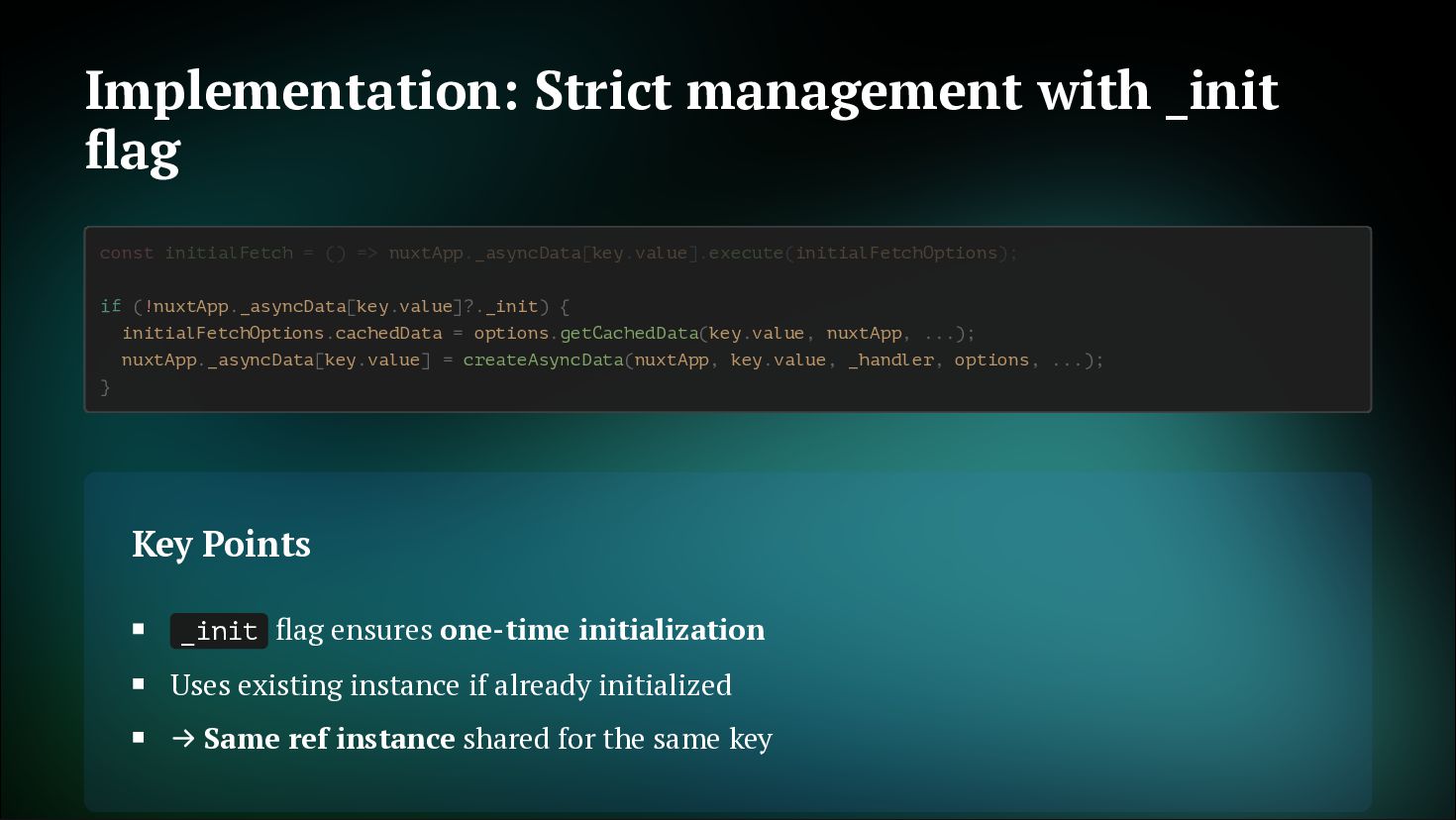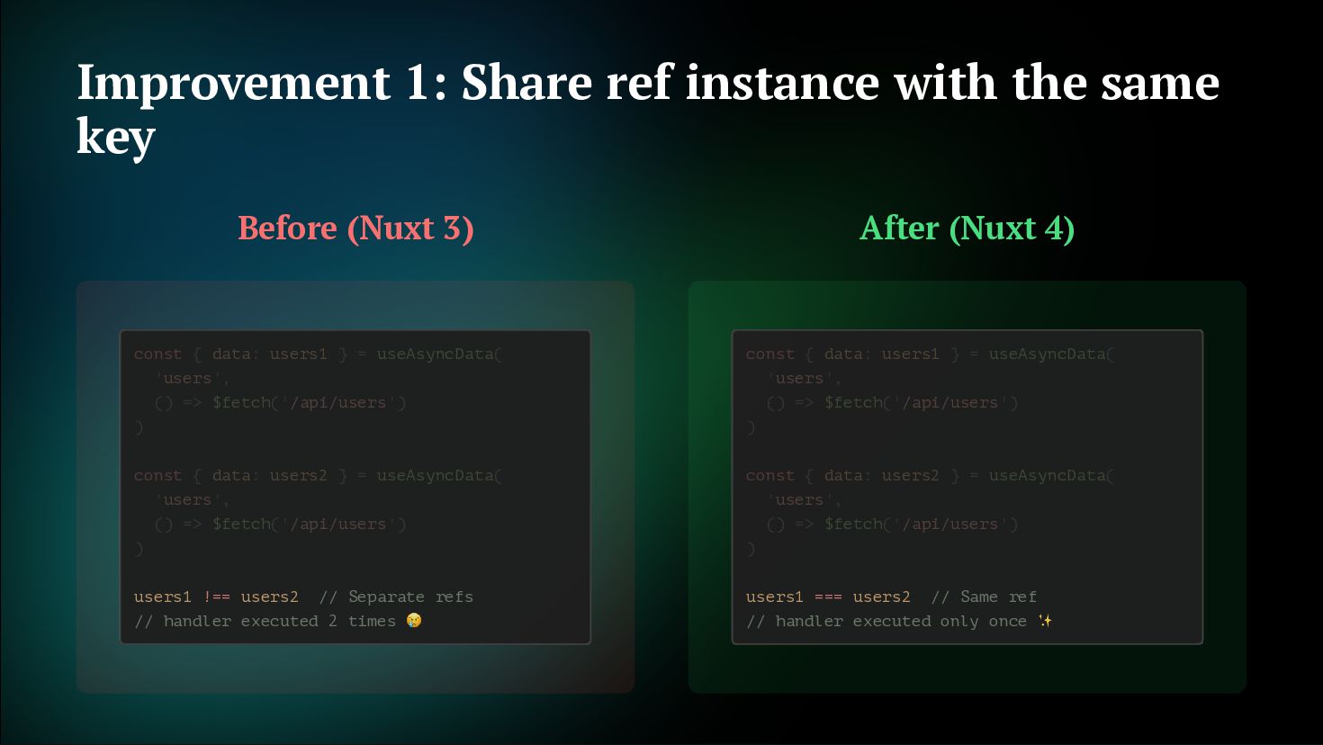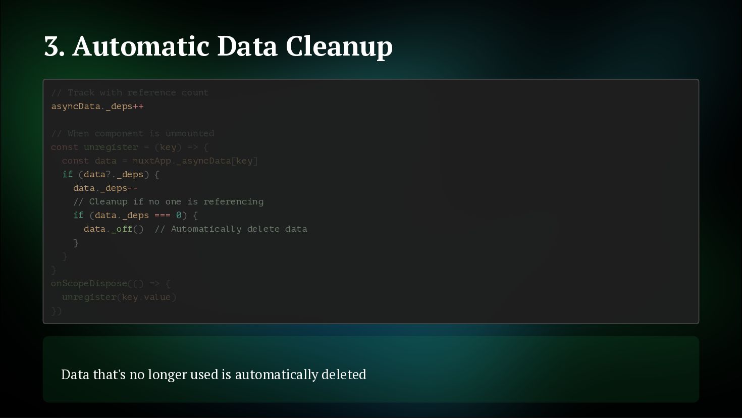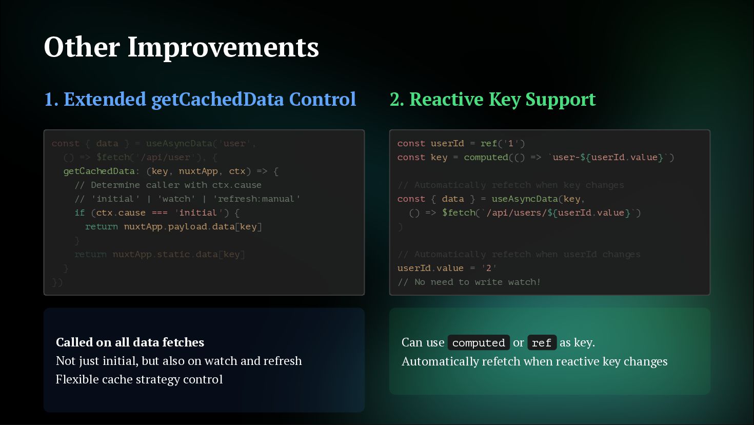 fetches Not just initial, but also on watch and refresh Flexible cache strategy control 2. Reactive Key Support Can use computed or ref as key. Automatically refetch when reactive key changes getCachedData: (key, nuxtApp, ctx) => { // Determine caller with ctx.cause // 'initial' | 'watch' | 'refresh:manual' if (ctx.cause === 'initial') { return nuxtApp.payload.data[key] const { data } = useAsyncData('user', () => $fetch('/api/user'), { } return nuxtApp.static.data[key] } }) const userId = ref('1') const key = computed(() => `user-${userId.value}`) const { data } = useAsyncData(key, () => $fetch(`/api/users/${userId.value}`) userId.value = '2' // No need to write watch! // Automatically refetch when key changes ) // Automatically refetch when userId changes