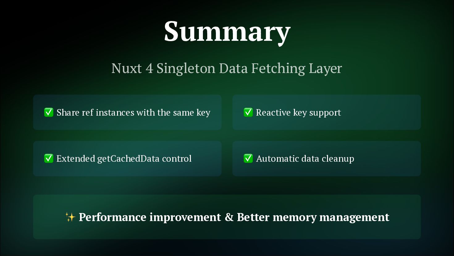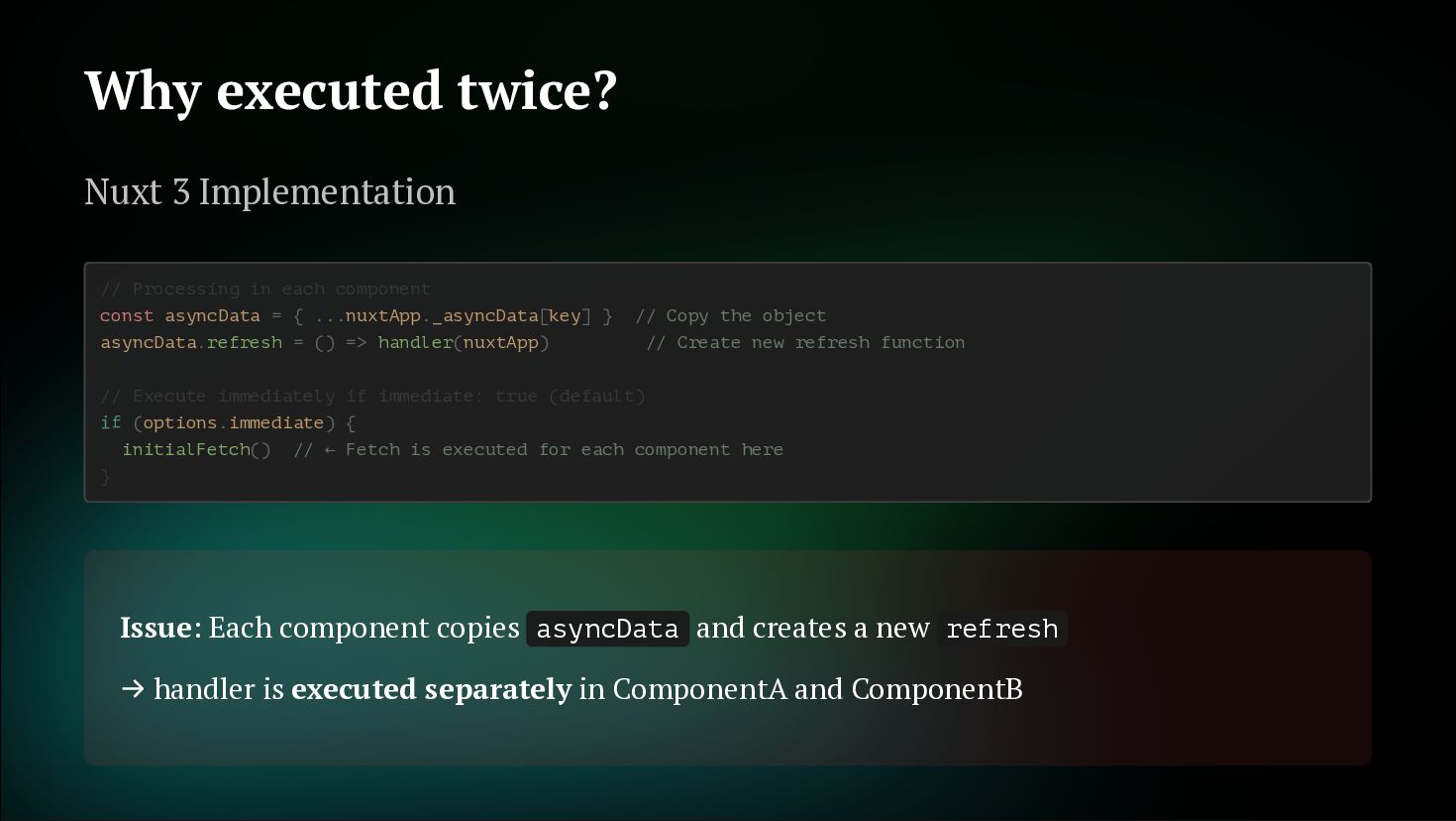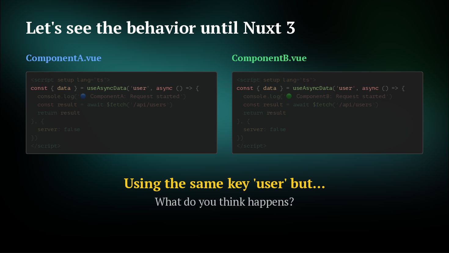 fetches Not just initial, but also on watch and refresh Flexible cache strategy control 2. Reactive Key Support Can use computed or ref as key. Automatically refetch when reactive key changes getCachedData: (key, nuxtApp, ctx) => { // Determine caller with ctx.cause // 'initial' | 'watch' | 'refresh:manual' if (ctx.cause === 'initial') { return nuxtApp.payload.data[key] const { data } = useAsyncData('user', () => $fetch('/api/user'), { } return nuxtApp.static.data[key] } }) const userId = ref('1') const key = computed(() => `user-${userId.value}`) const { data } = useAsyncData(key, () => $fetch(`/api/users/${userId.value}`) userId.value = '2' // No need to write watch! // Automatically refetch when key changes ) // Automatically refetch when userId changes