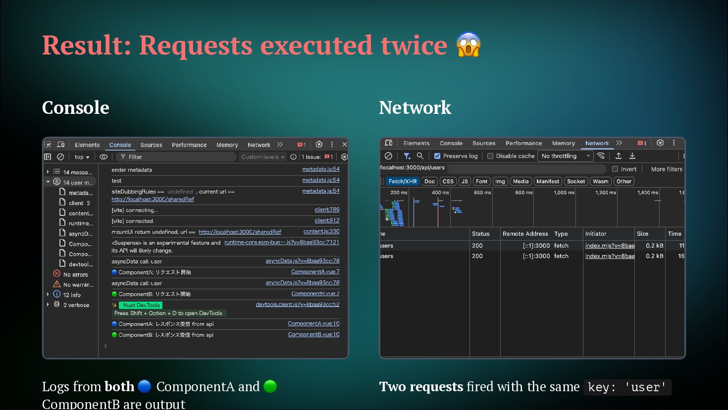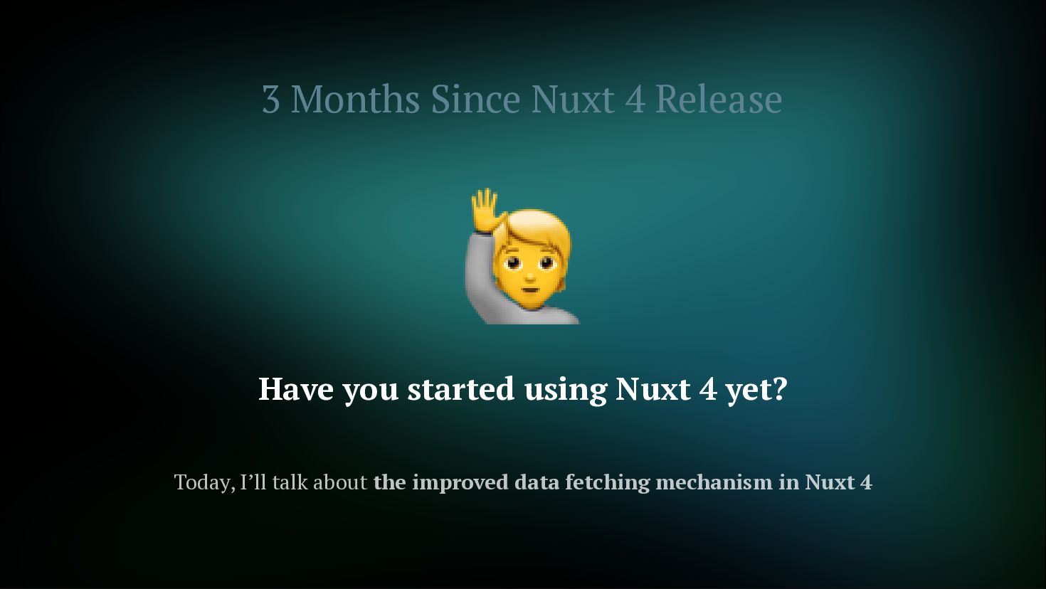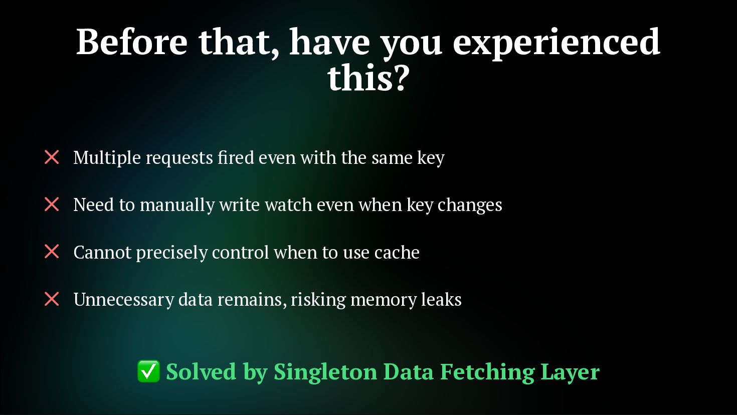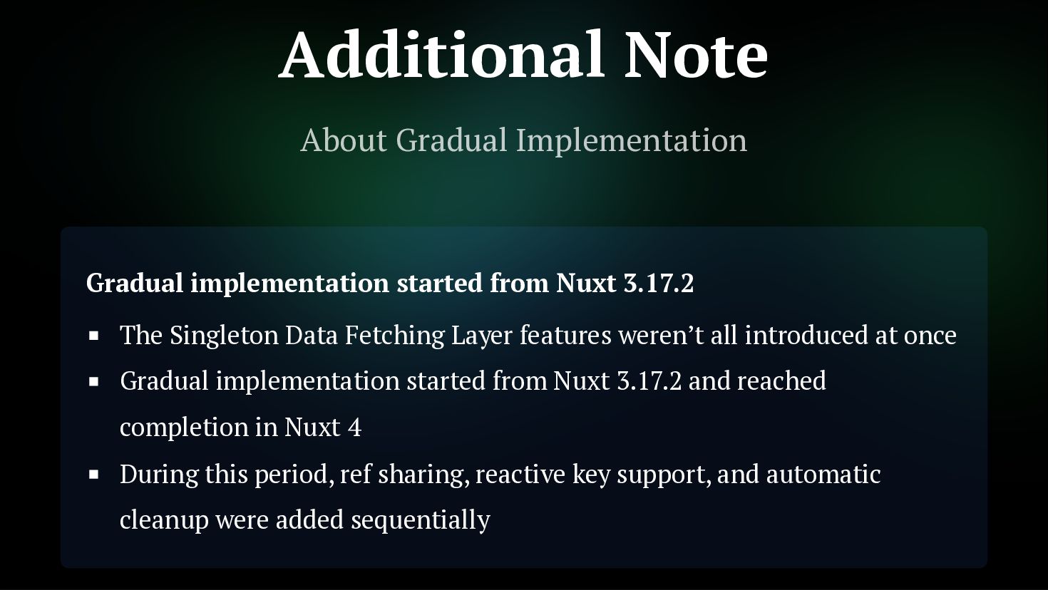 fetches Not just initial, but also on watch and refresh Flexible cache strategy control 2. Reactive Key Support Can use computed or ref as key. Automatically refetch when reactive key changes getCachedData: (key, nuxtApp, ctx) => { // Determine caller with ctx.cause // 'initial' | 'watch' | 'refresh:manual' if (ctx.cause === 'initial') { return nuxtApp.payload.data[key] const { data } = useAsyncData('user', () => $fetch('/api/user'), { } return nuxtApp.static.data[key] } }) const userId = ref('1') const key = computed(() => `user-${userId.value}`) const { data } = useAsyncData(key, () => $fetch(`/api/users/${userId.value}`) userId.value = '2' // No need to write watch! // Automatically refetch when key changes ) // Automatically refetch when userId changes