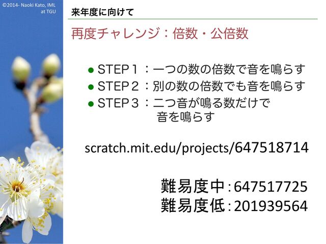 l 45&1̎ɿผͷͷഒͰԻΛ໐Β͢ l 45&1̏ɿೋͭԻ͕໐Δ͚ͩͰ ԻΛ໐Β͢ scratch.mit.edu/projects/647518714 難易度中:647517725 難易度低:201939564