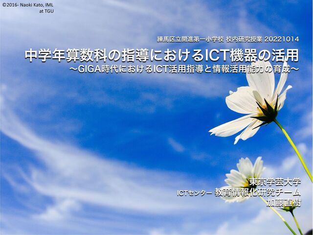 p その前に自分の考えを引き出す - 手軽に書けること p 共有の時間が短かった p 共有の時間に間違いを見つけて治していた子がいた p 他の子のをじっくりみているこもいた p 対話が少なかった リアルタイムのなにか p 友達の考えにコメント l おくりんく n 自分ボックス=ノートの代わりとして p 振り返りやすさ p カードをつなげられること - 学習の流れがはあくしやすい n 提出ボックスをつかった l タブレットでやり遂げた p やってみて,確かめたかった p 紙と併用が大事かなと l デジタル教材 p つかったら考えがいっぱい出た p 書くことが苦手な子も,切ったり動かしたりしていた p 一方で切り刻む子も p とりあえずやってみるという点でよかった l 算数 p たくさんの考えが出ていたのはよかった p つぎにつながるとおもった p 公式につながるためには・・・・ l 教材 p 作るの大変 l まとめ p あなつめ