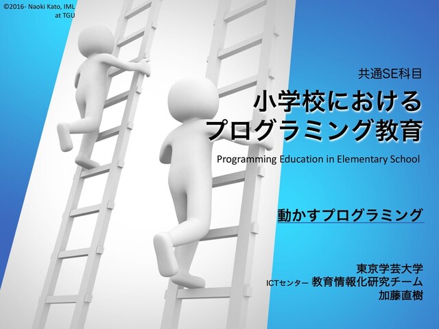©2016- Naoki Kato, IML at TGU プログラミング教育の展開 動くプログラミングと系統的な学び 創造的プログラミング 情報化社会に関する