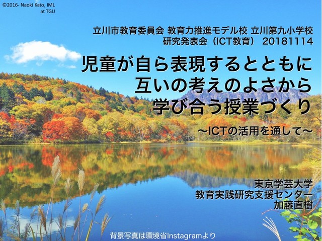 20181114 児童が自ら表現するとともに 互いの考えのよさから 学び合う授業づくり ~ICTの活用を通して~ 東京学芸大学 教育実践研究支援センター 加藤直樹 背景写真は環境省Instagramより