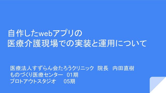 自作したwebアプリの 医療介護現場での実装と運用について 医療法人すずらん会たろうクリニック 院長 内田直樹 ものづくり医療センター 01期 プロトアウトスタジオ 05期