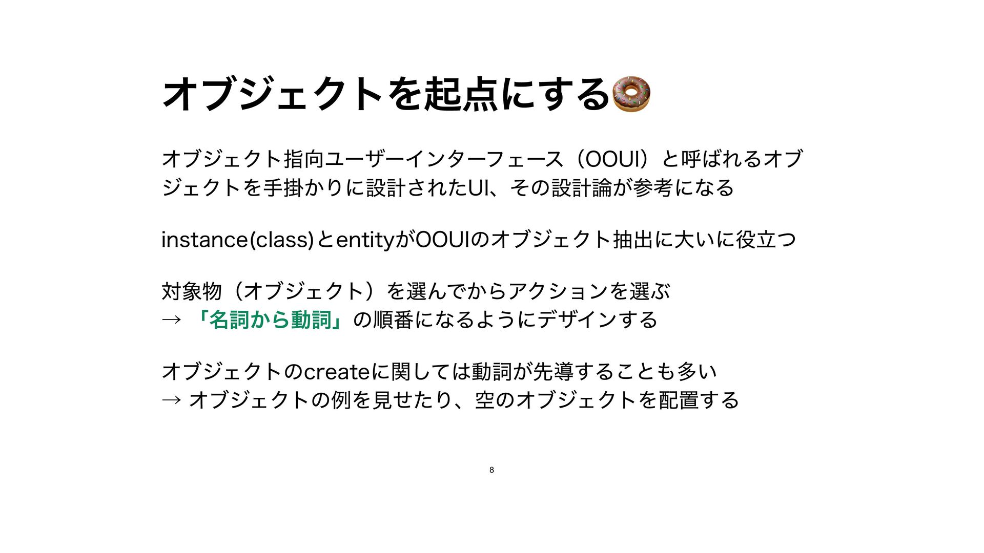 ΦϒδΣΫτࢦϢʔβʔΠϯλʔϑΣʔεʢ006*ʣͱݺΕΔΦϒ δΣΫτΛखֻ͔Γʹઃܭ͞Εͨ6*ɺͦͷઃܭ͕ࢀߟʹͳΔ JOTUBODF DMBTT ͱFOUJUZ͕006*ͷΦϒδΣΫτநग़ʹେ͍ʹཱͭ ରʢΦϒδΣΫτʣΛબΜͰ͔ΒΞΫγϣϯΛબͿ ˠʮ໊ࢺ͔Βಈࢺʯͷॱ൪ʹͳΔΑ͏ʹσβΠϯ͢Δ ΦϒδΣΫτͷDSFBUFʹؔͯ͠ಈࢺ͕ઌಋ͢Δ͜ͱଟ͍