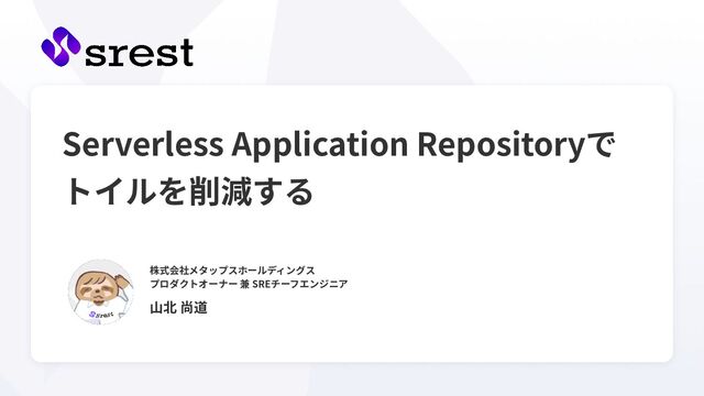 SREチーフエンジニア Yamakita Naomichi X : @sre_yamakita ベトナム‧ハノイでのオフショア事業⽴ち上げからキャリアをスタート し、アプリケーション開発からマネジメントまでを経験 2015年に当社参画。徐々にクラウドインフラにも携わり、現在は横断的な テックリードやSREチーフエンジニアとして従事 「AWS DevDay Tokyo 2019」登壇、「Amazon Web Services ブログ」、 「builders.flash」寄稿など 昨年からはSREのためのダッシュボード「srest」のプロダクトオーナーを 兼任