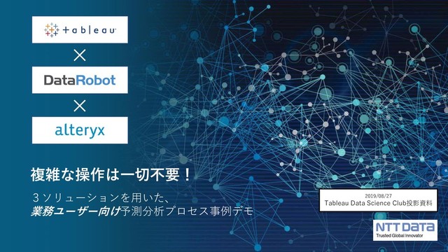 × × 3ソリューションを用いた、 業務ユーザー向け予測分析プロセス事例デモ 複雑な操作は一切不要! 2019/08/27 Tableau Data Science Club投影資料