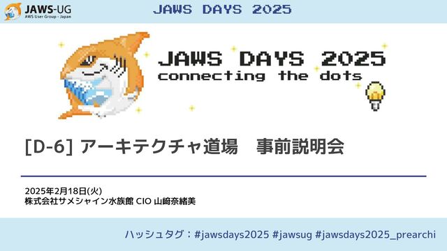 [D-6] アーキテクチャ道場 事前説明会 2025年2月18日(火) 株式会社サメシャイン水族館 CIO 山﨑奈緒美 ハッシュタグ:#jawsdays2025 #jawsug #jawsdays2025_prearchi