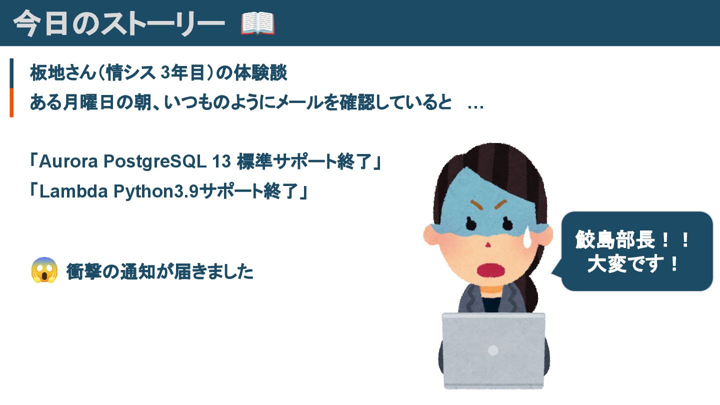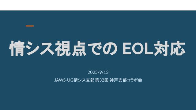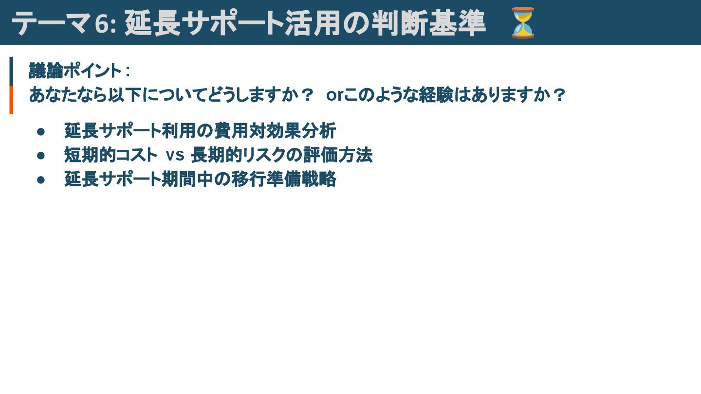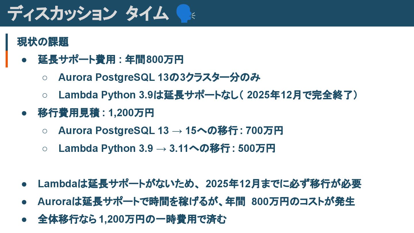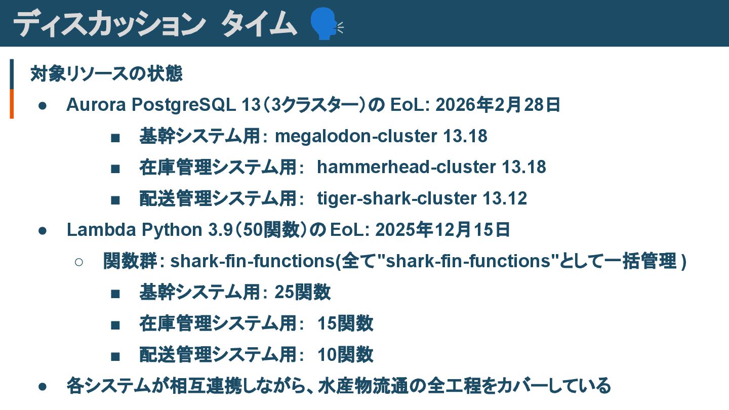2025/9/13 に行われたJAWS-UG情シス支部×神戸支部コラボでのチョークトークです。 LambdaやRDS/AuroraのEoLが発生していますが、これについてどのように対処していくべきかのディスカッションを行いました。