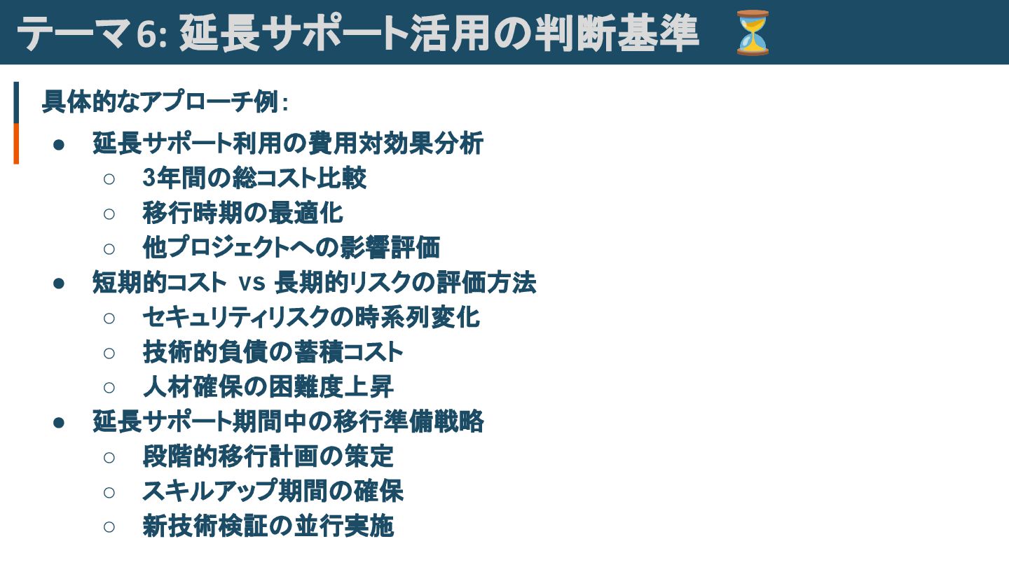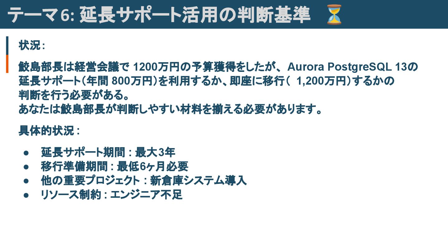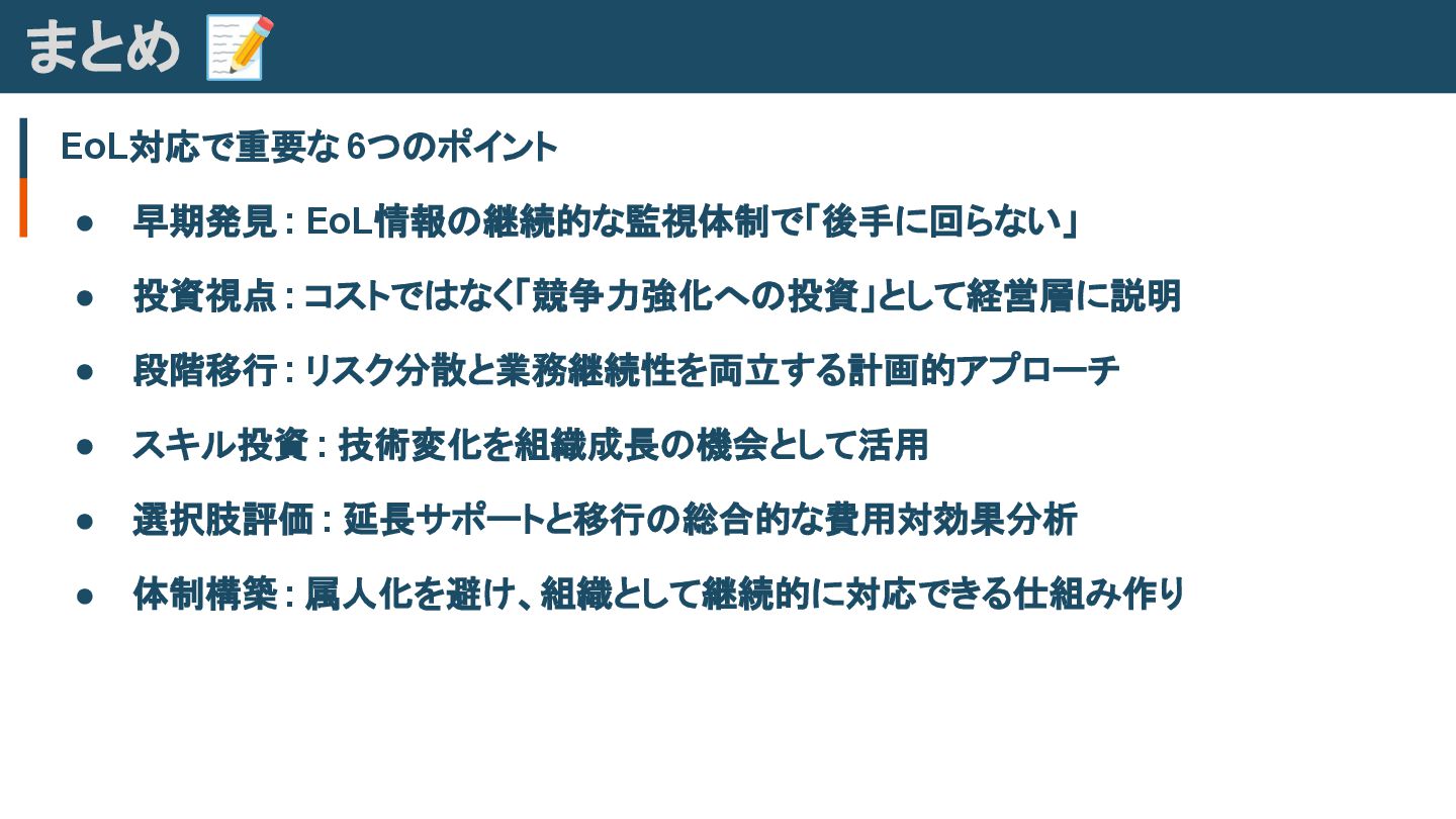 2025/9/13 に行われたJAWS-UG情シス支部×神戸支部コラボでのチョークトークです。 LambdaやRDS/AuroraのEoLが発生していますが、これについてどのように対処していくべきかのディスカッションを行いました。
