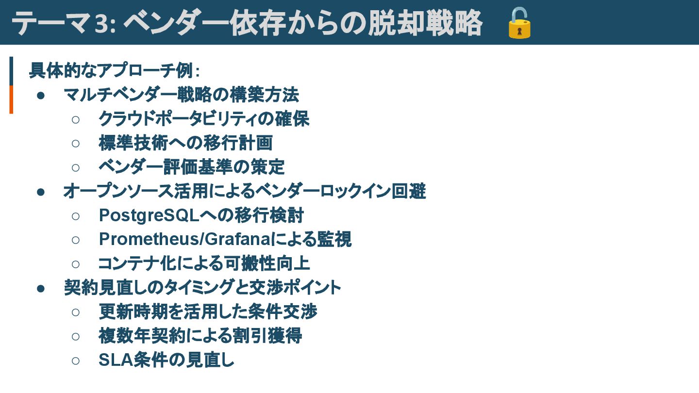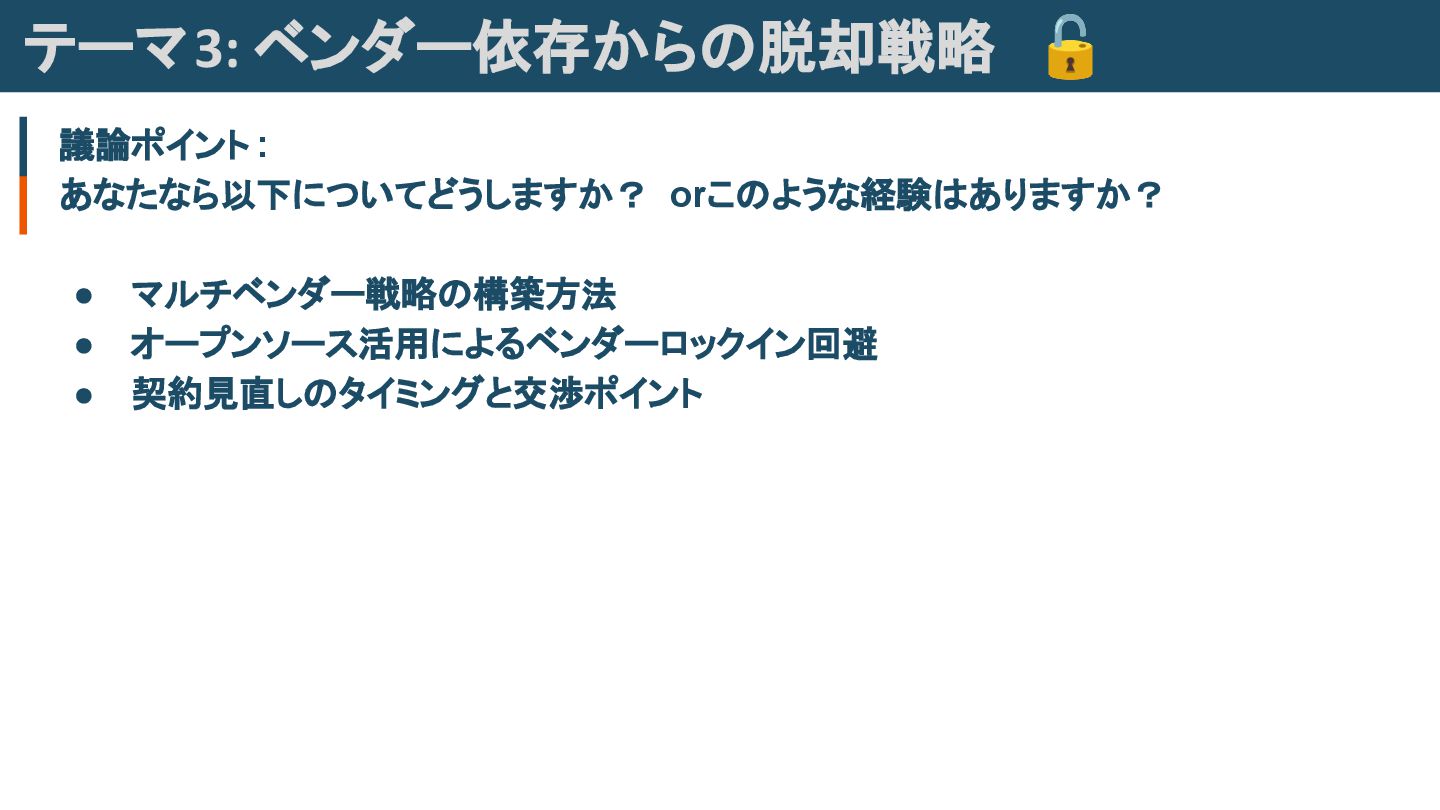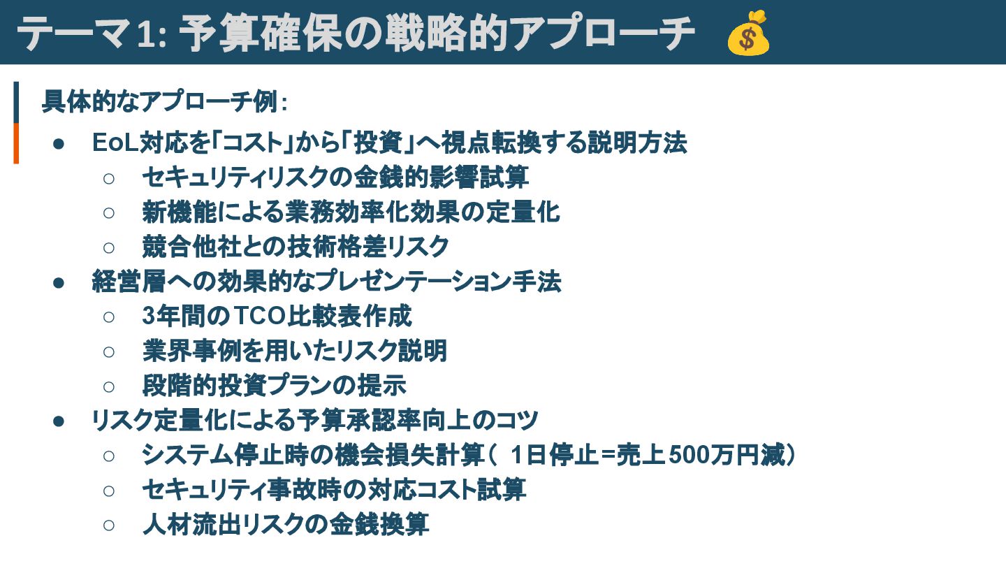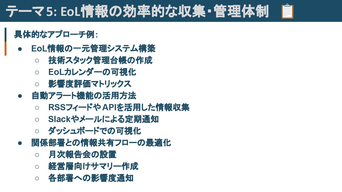2025/9/13 に行われたJAWS-UG情シス支部×神戸支部コラボでのチョークトークです。 LambdaやRDS/AuroraのEoLが発生していますが、これについてどのように対処していくべきかのディスカッションを行いました。