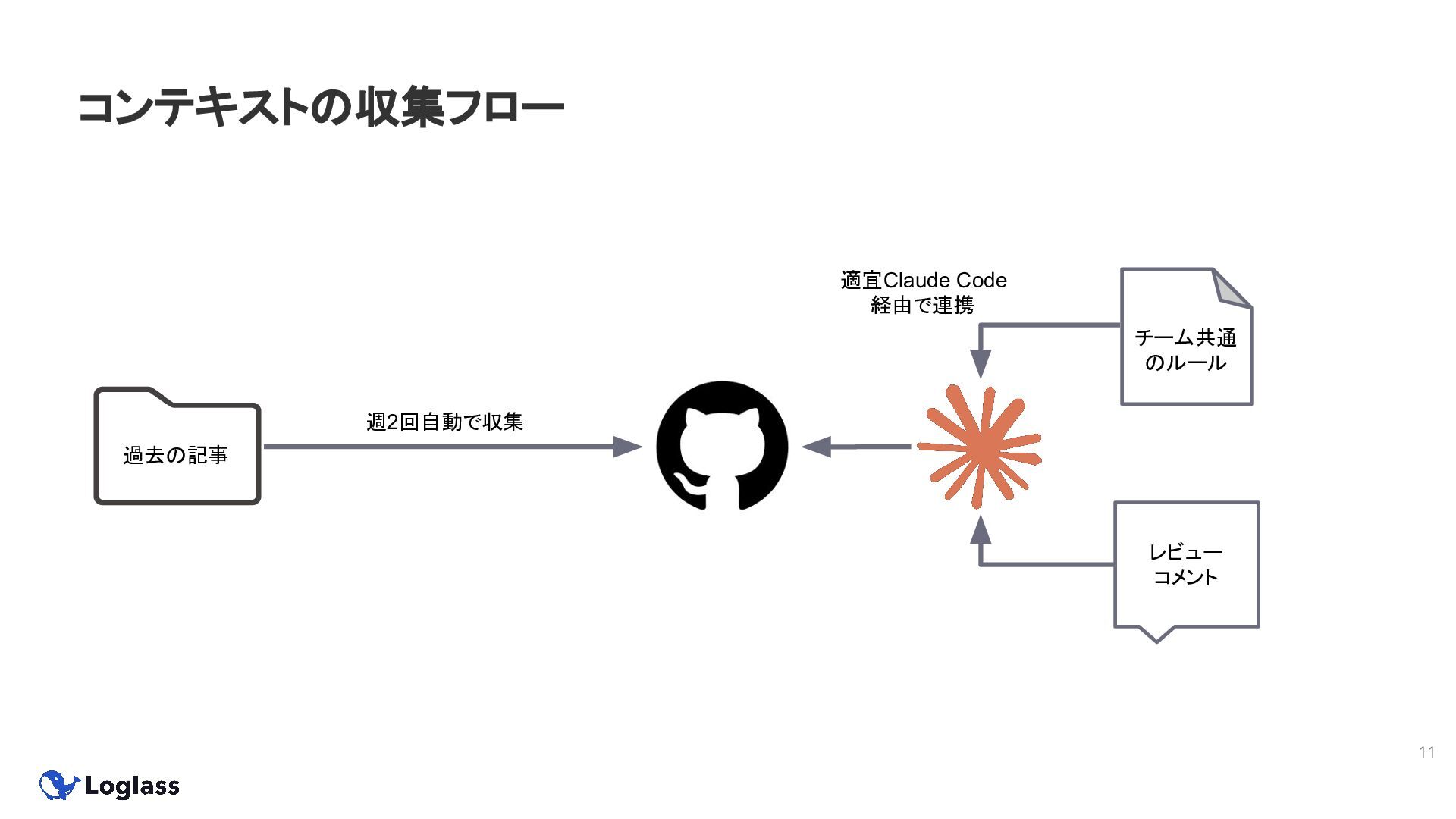 11 コンテキストの収集フロー 過去の記事 週2回自動で収集 チーム共通 のルール レビュー コメント 適宜Claude Code