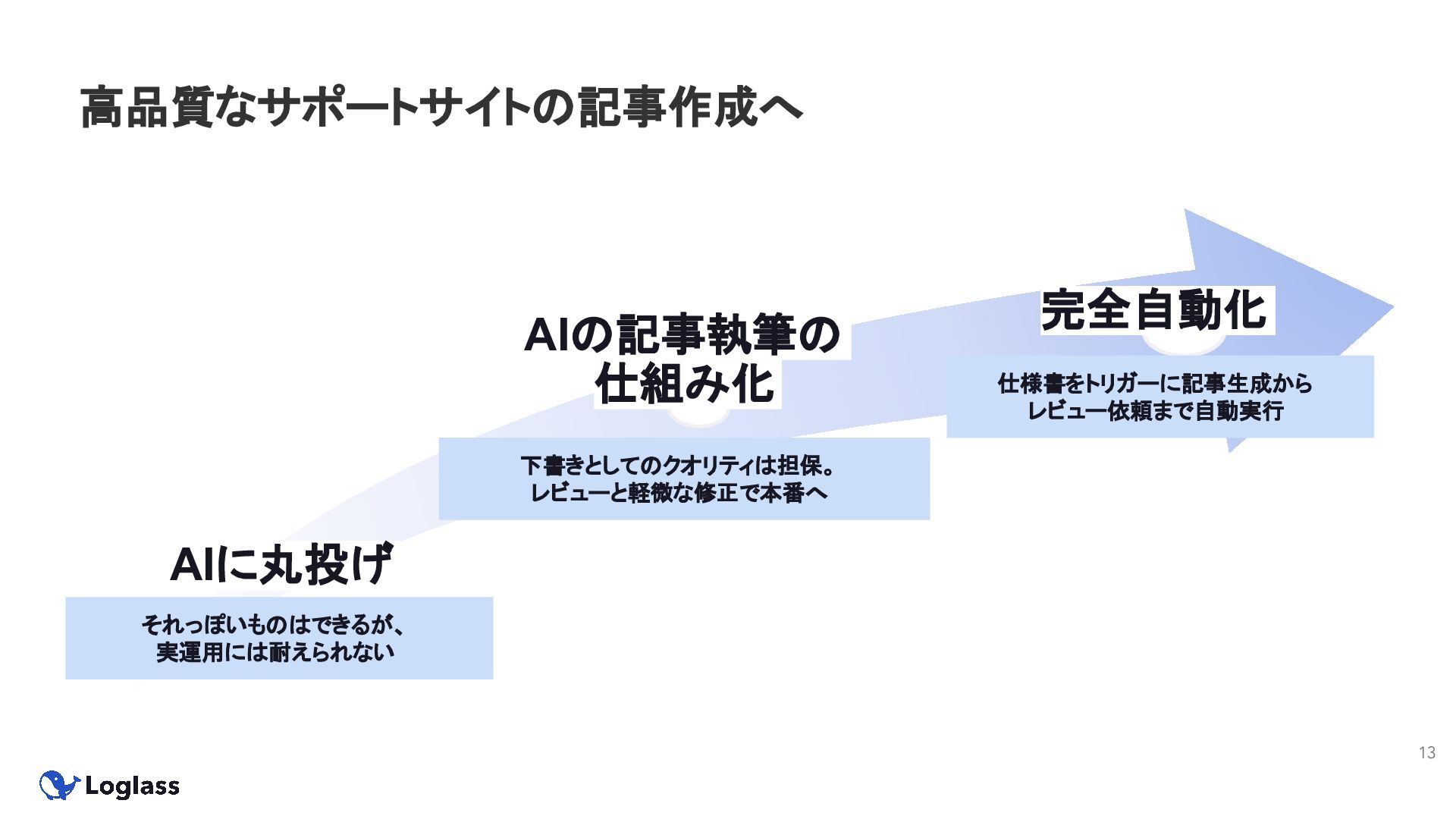 13 高品質なサポートサイトの記事作成へ AIに丸投げ それっぽいものはできるが、 実運用には耐えられない AIの記事執筆の 仕組み化 下書きとしてのクオリティは担保。 レビューと軽微な修正で本番へ 完全自動化
