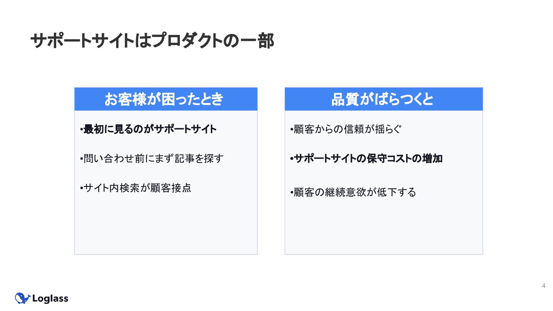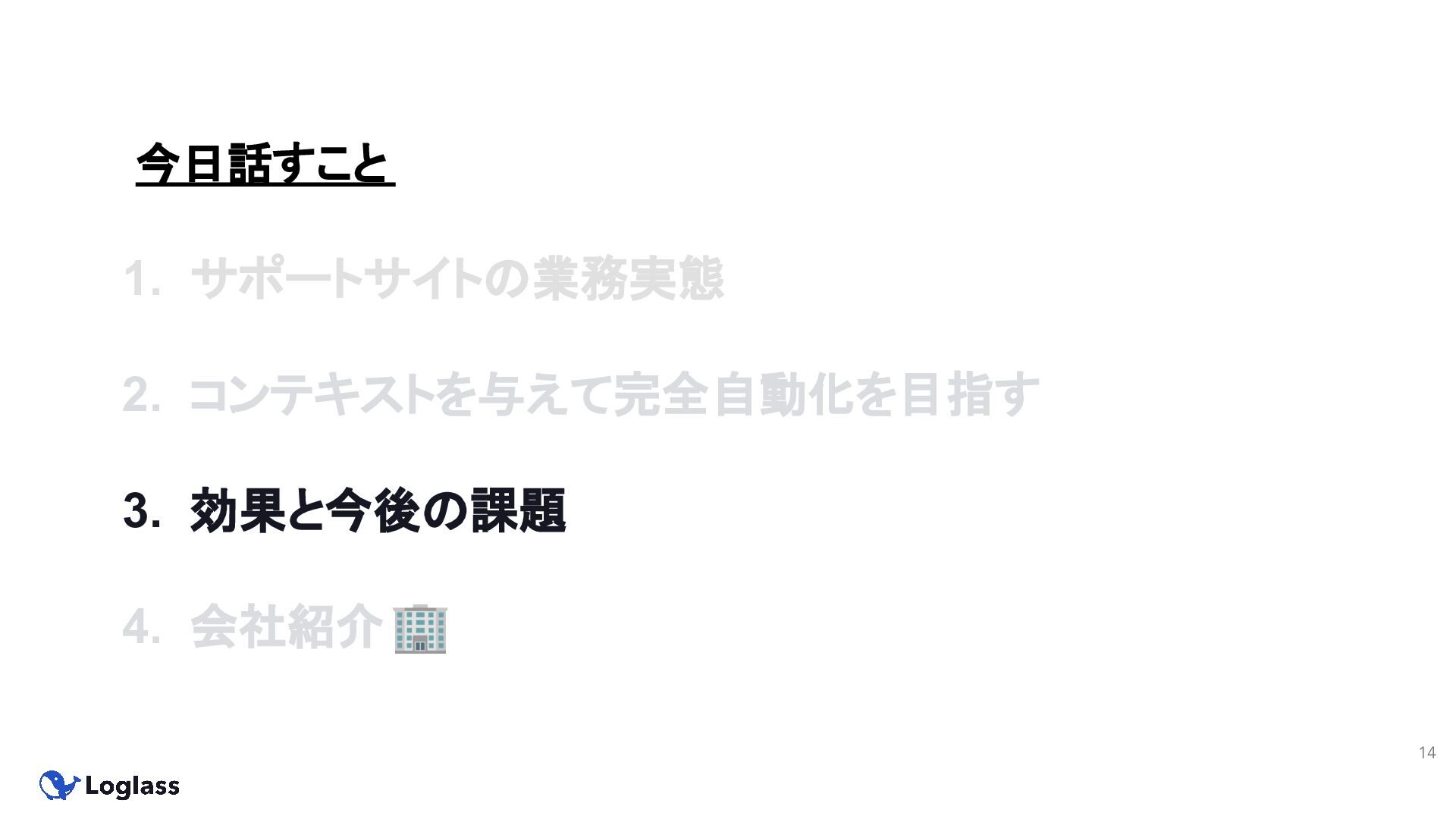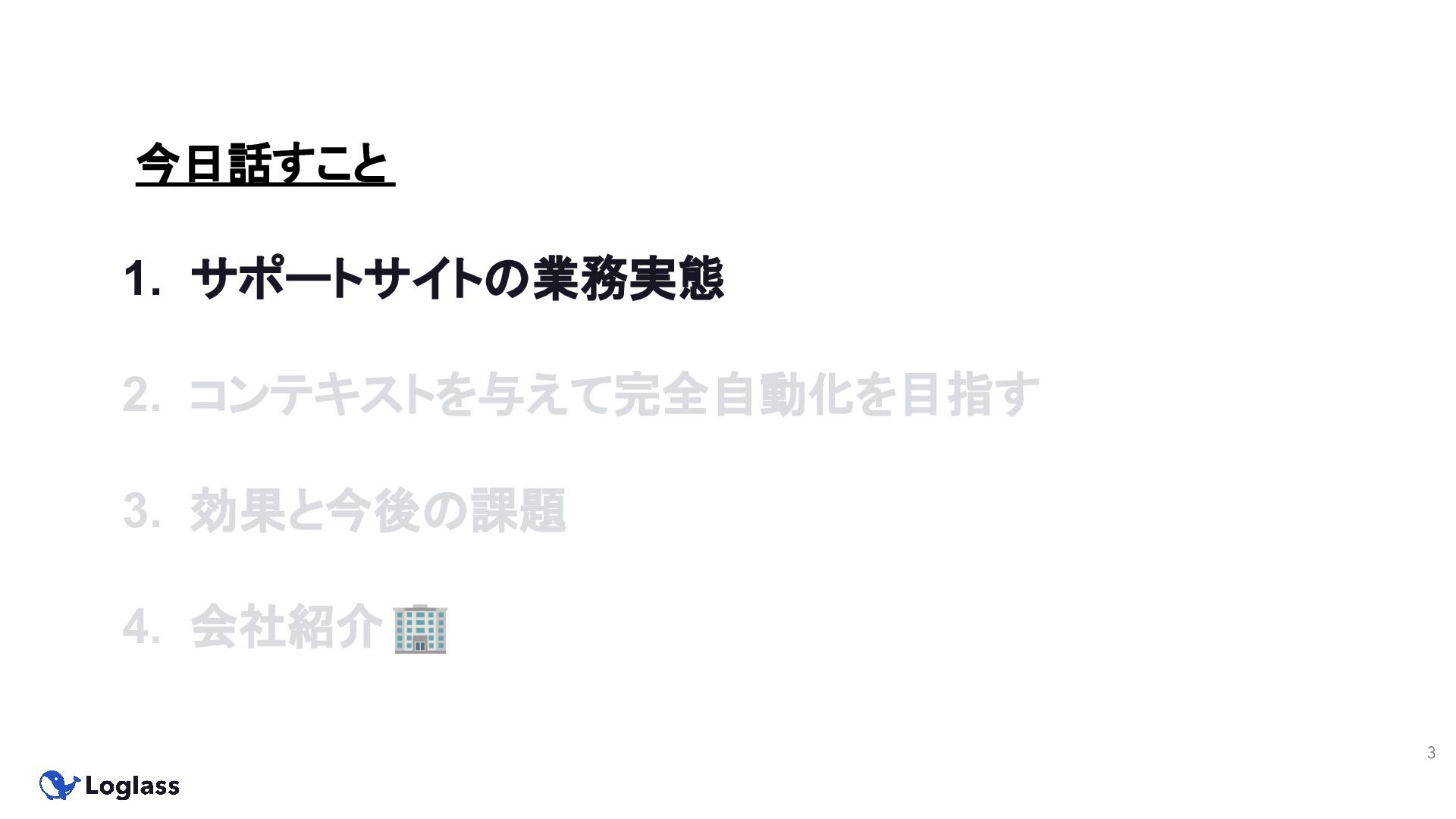 3 1. サポートサイトの業務実態 2. コンテキストを与えて完全自動化を目指す 3. 効果と今後の課題 4. 会社紹介🏢 今日話すこと