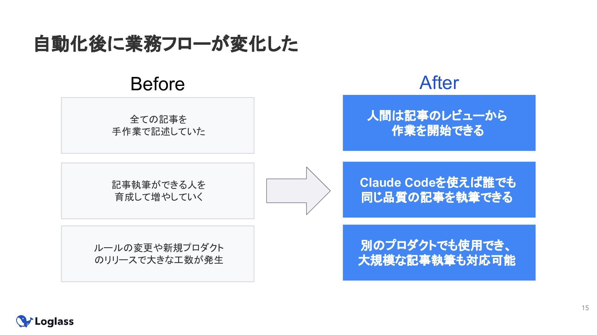 Claude Codeを使えば誰でも 同じ品質の記事を執筆できる 別のプロダクトでも使用でき、 大規模な記事執筆も対応可能 Before After